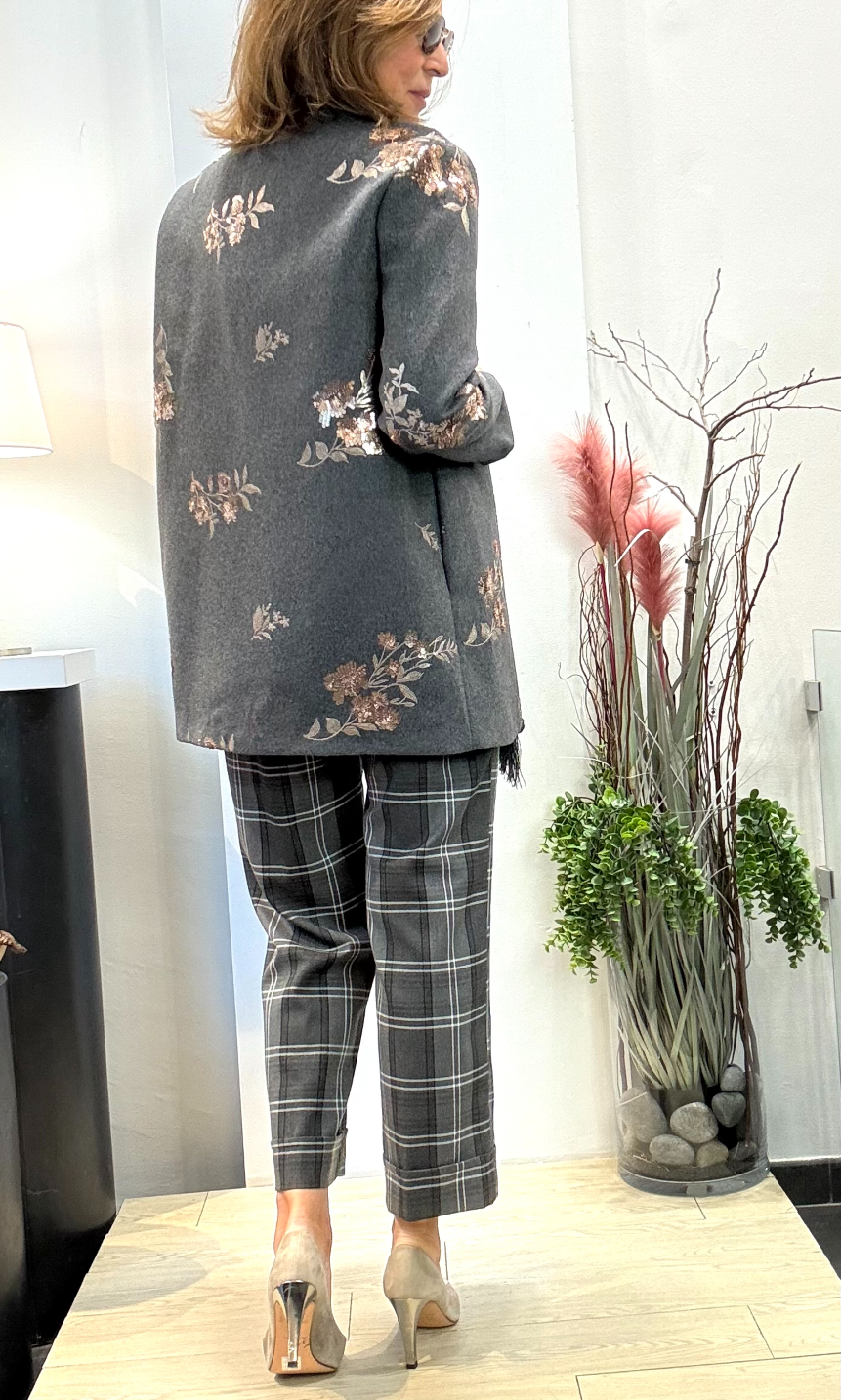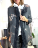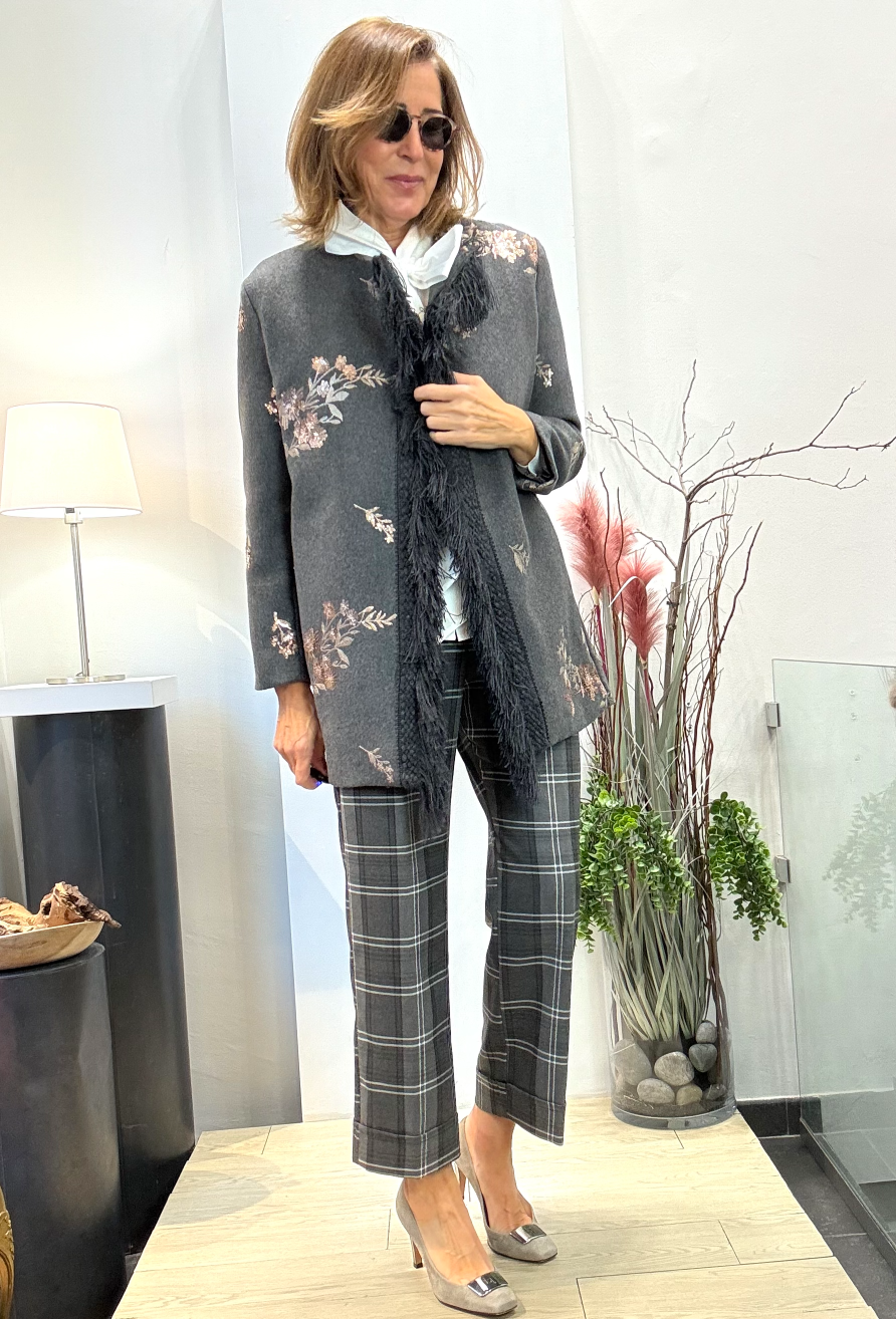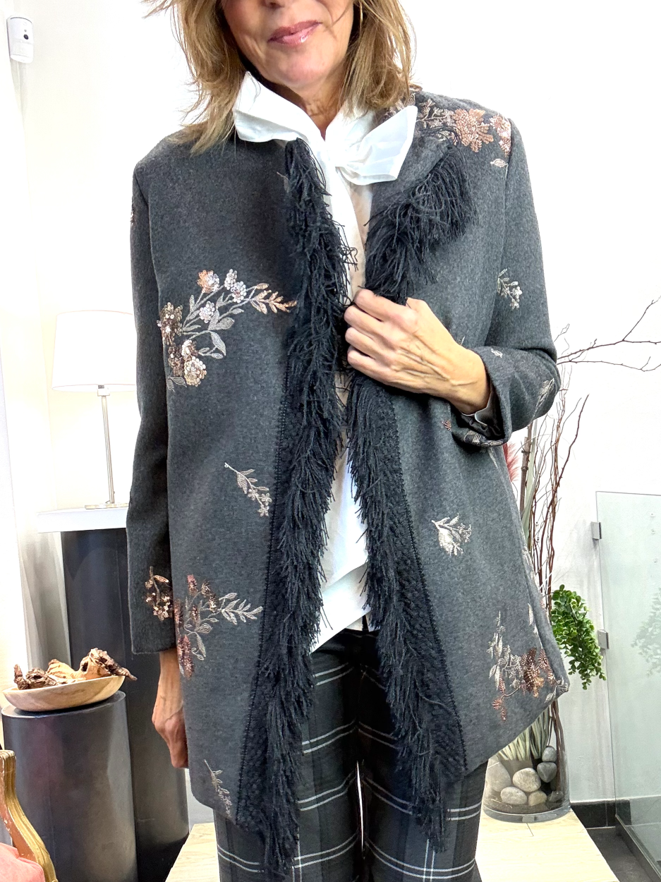Abrigo de franela con bordado y fleco de lana en la tira.