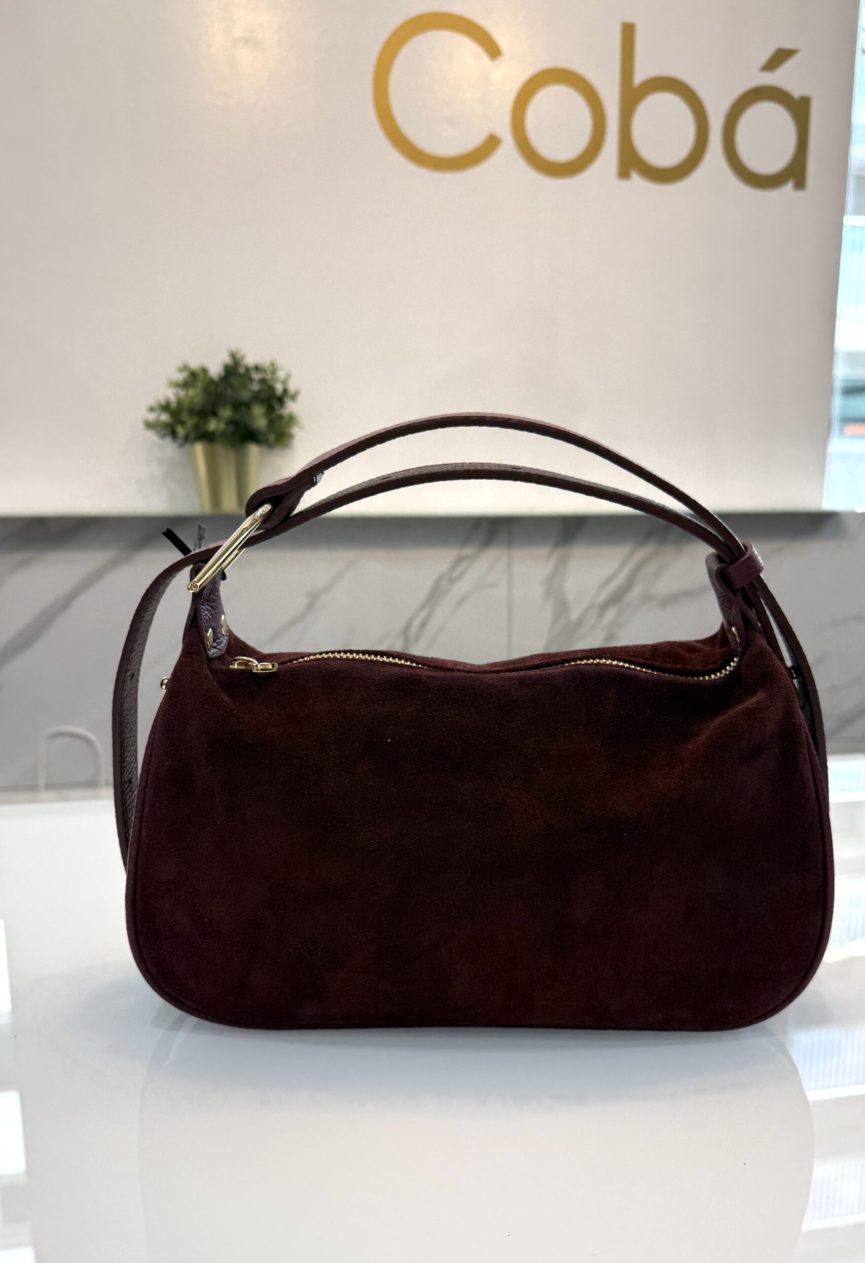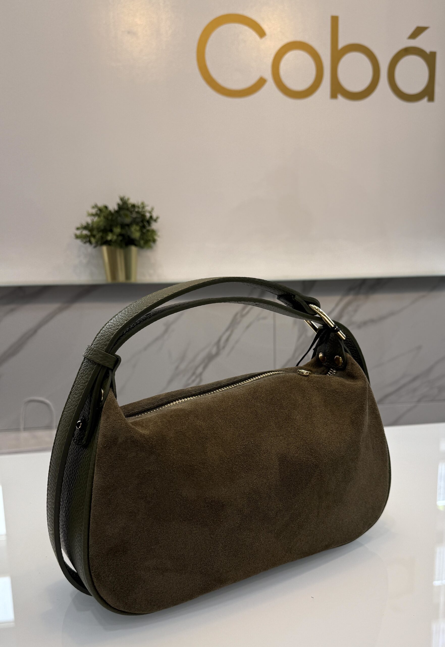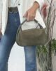 Bolso mediano combinado en serraje y piel grabada. Asa extensible. Cierre con cremallera e interior forrado con bolsillos.