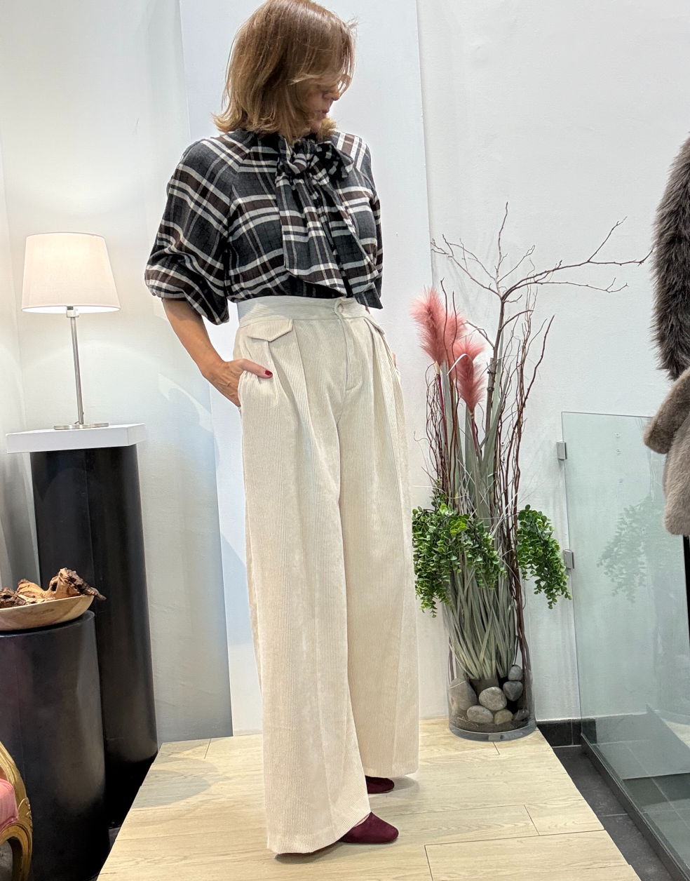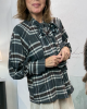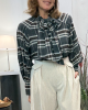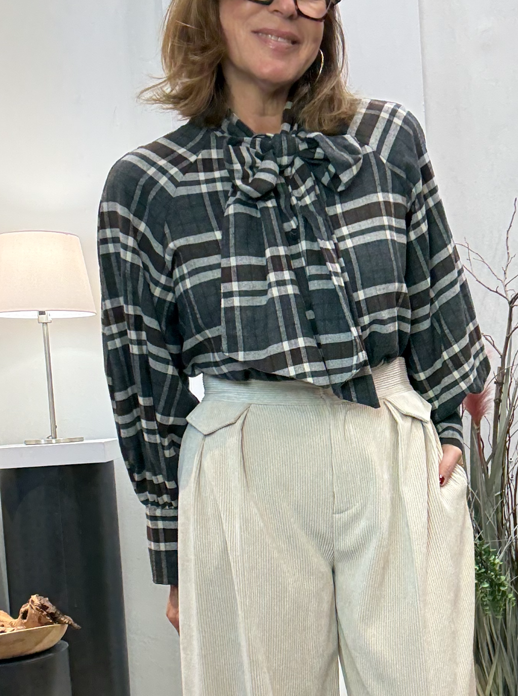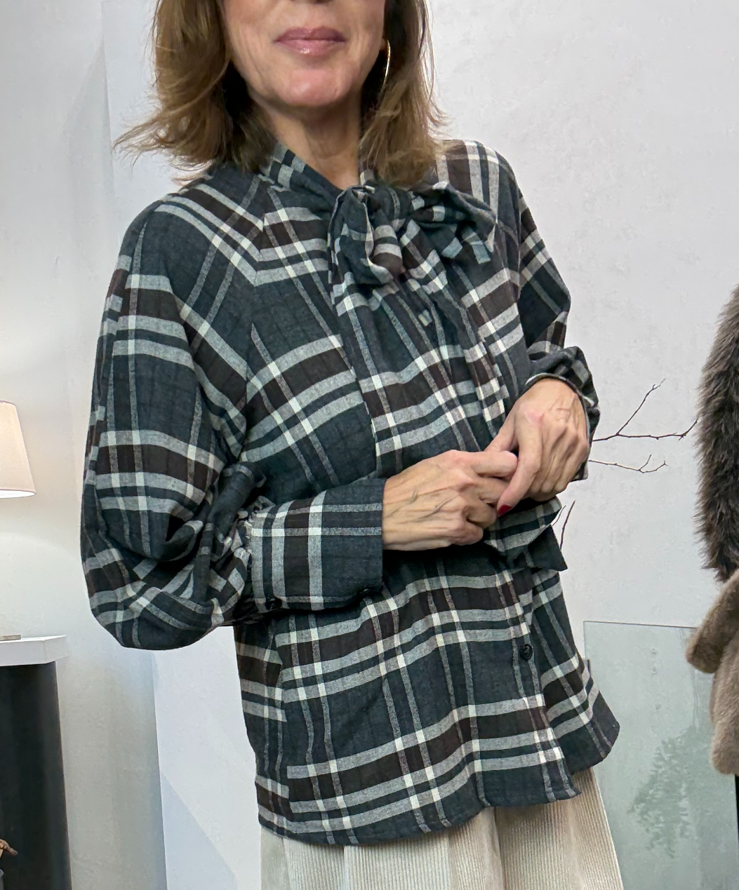 Camisa de cuadros ( gris, hielo y burgundy) con lazada y manga ranglan con vuelo y puño ancho.
