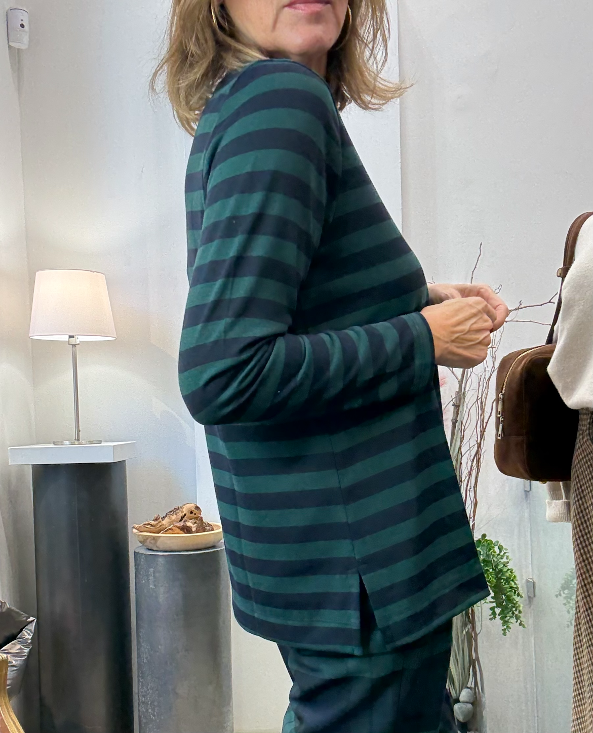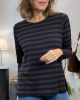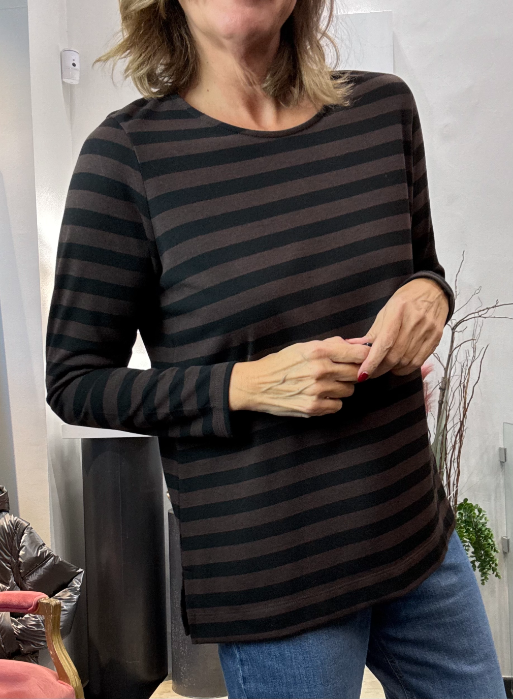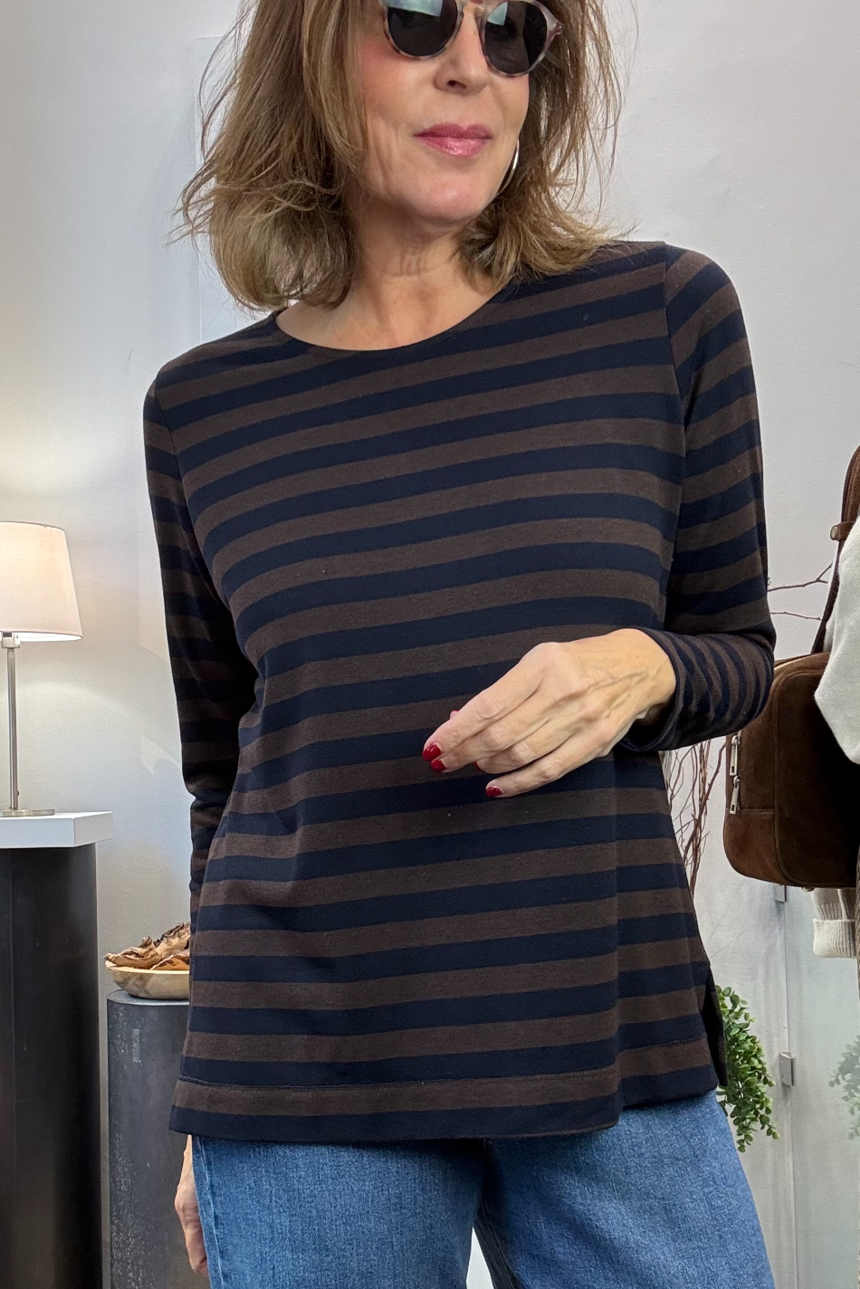 Camiseta de rayas bicolor, con escote redondo, corte evasé y aberturas laterales.