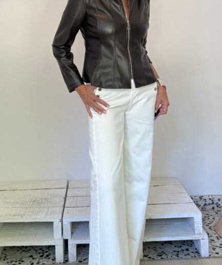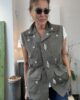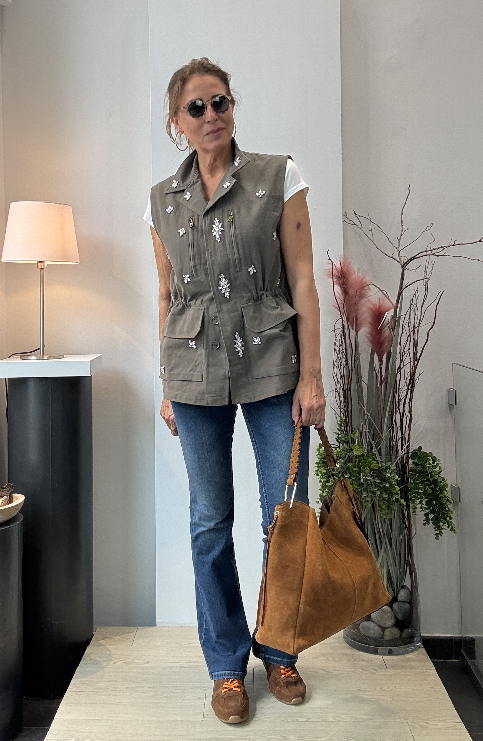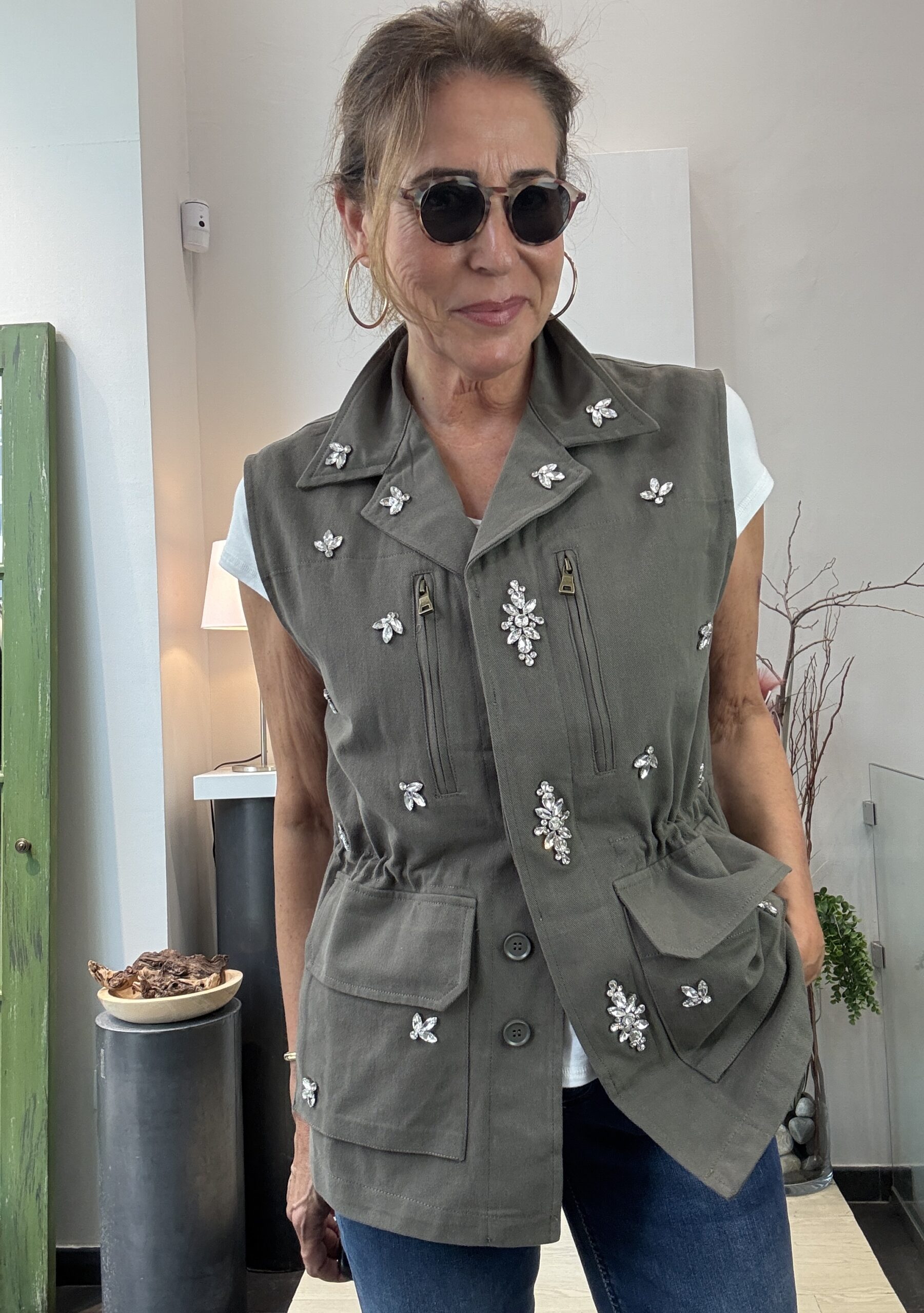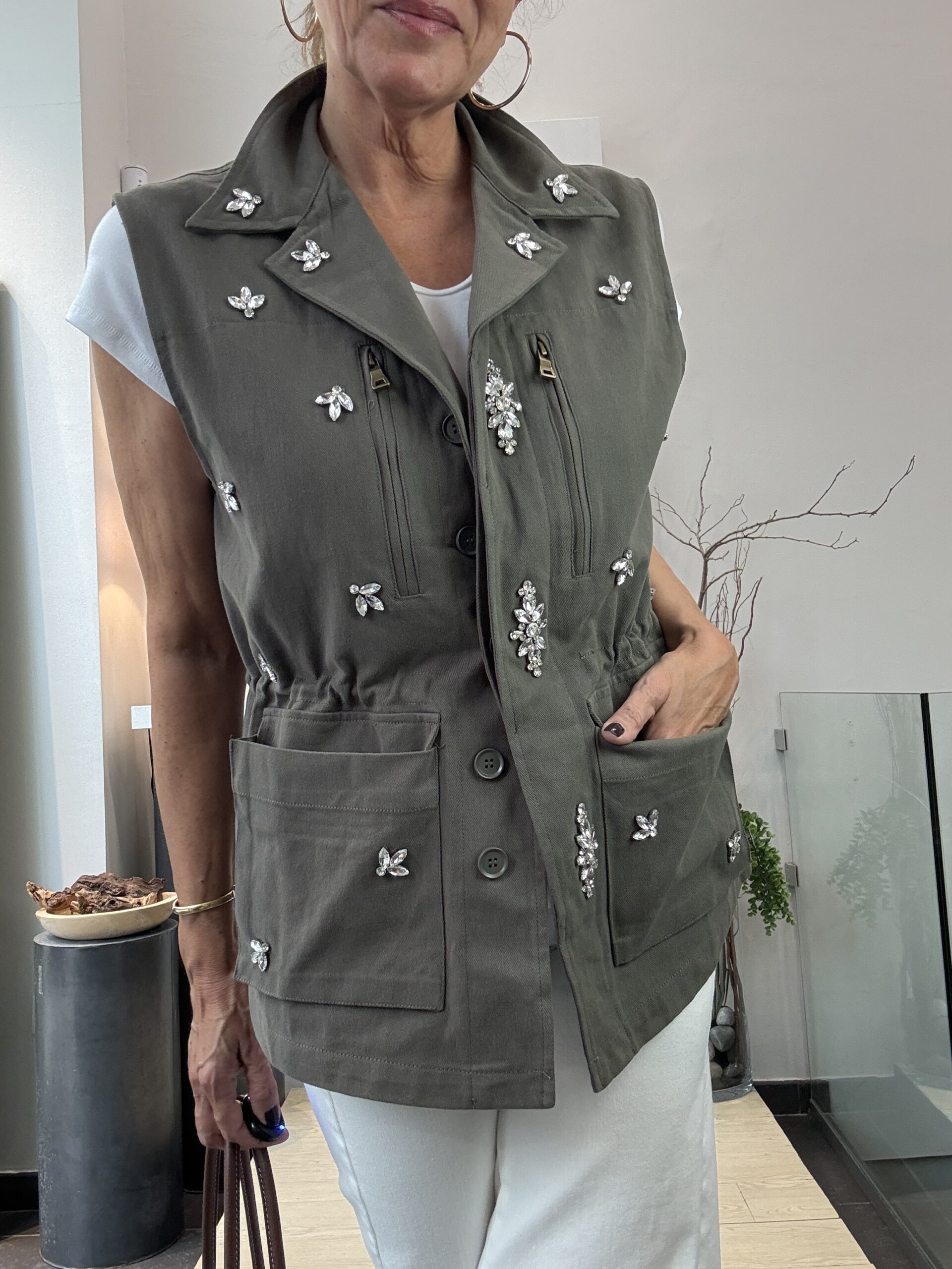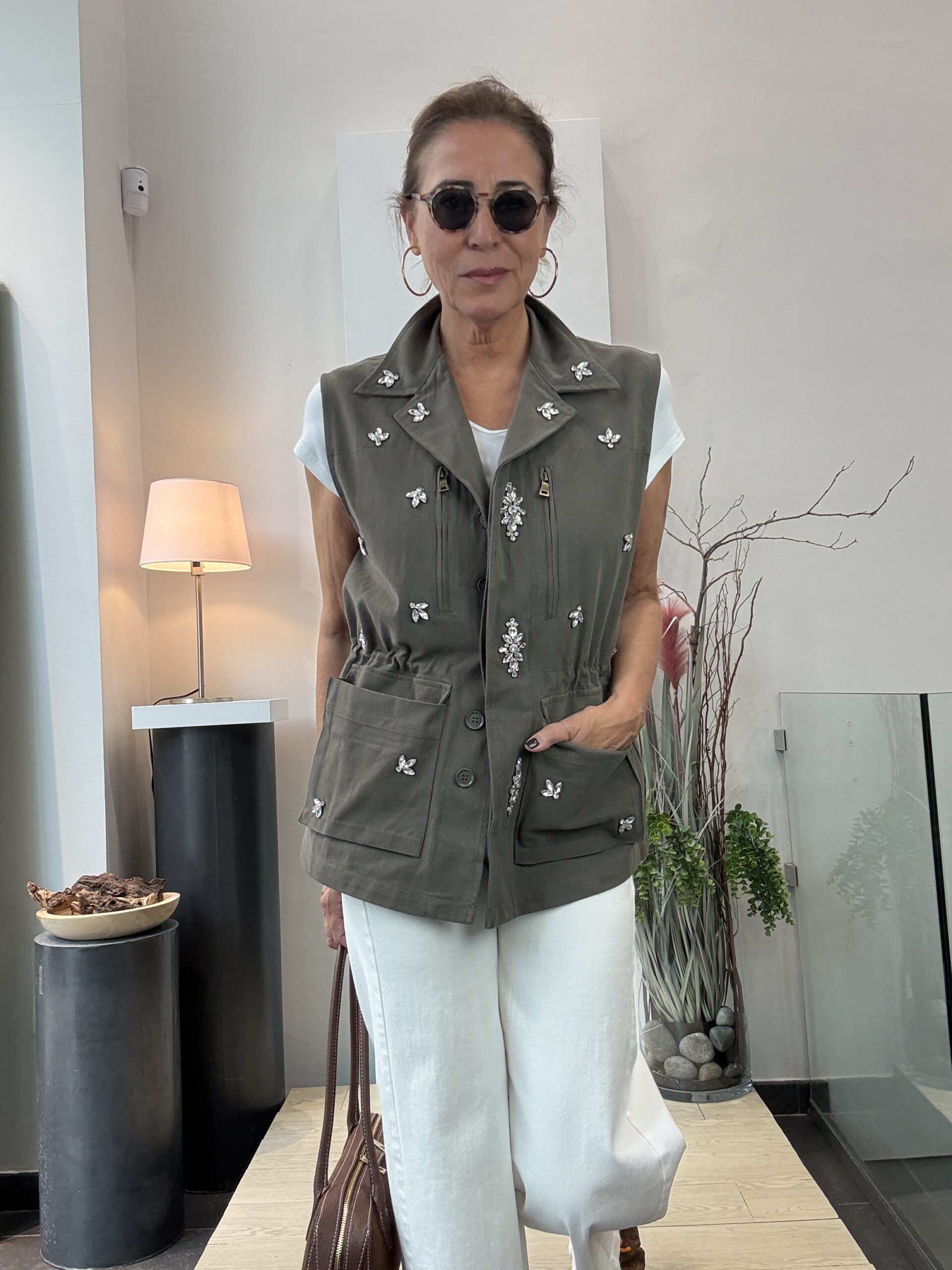 Chaleco de loneta con bolsillos y cremalleras con aplicaciones de cristal.