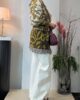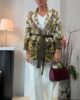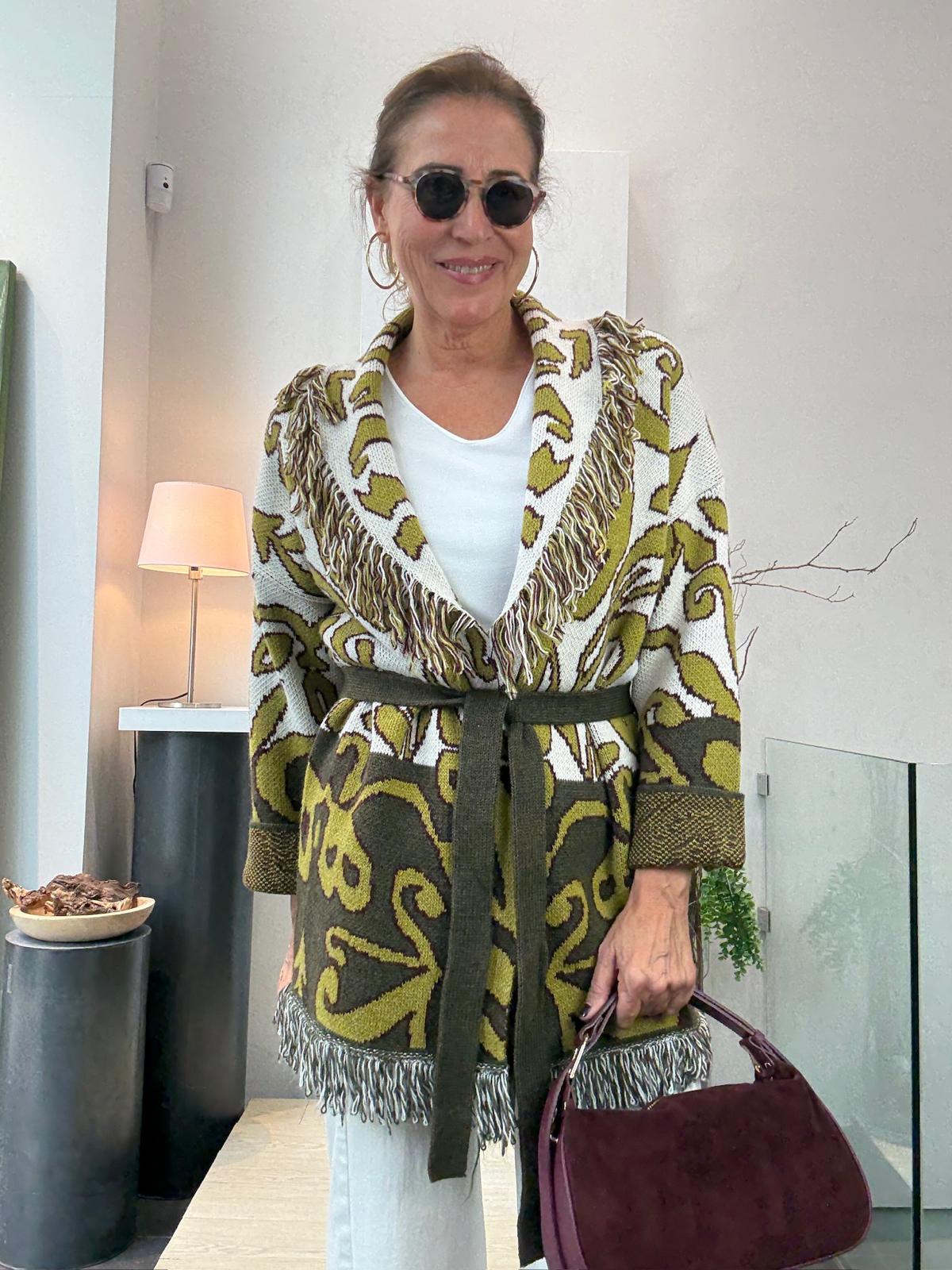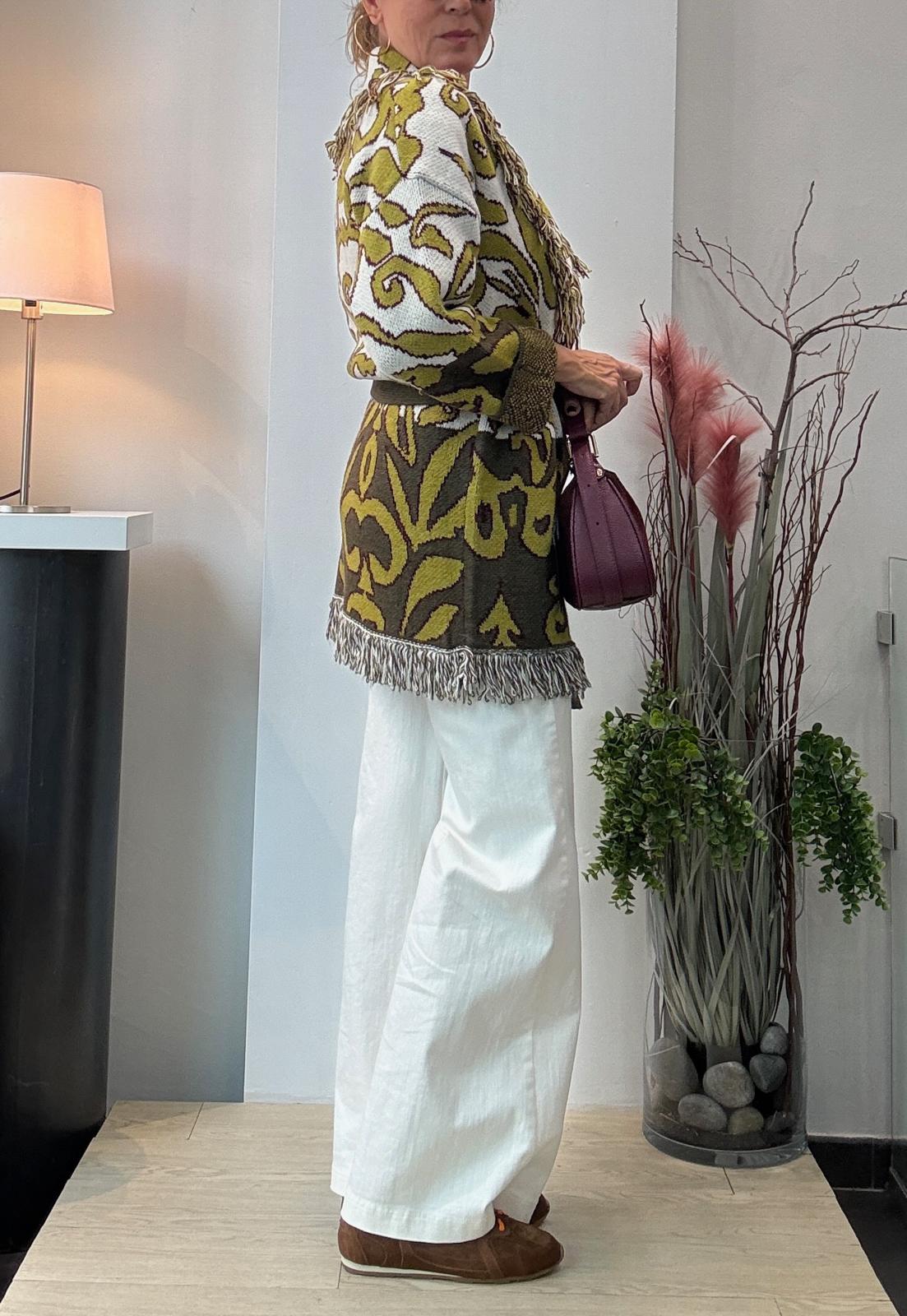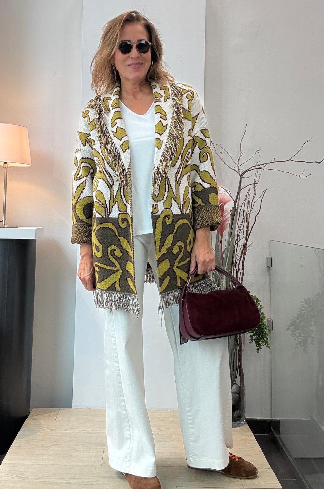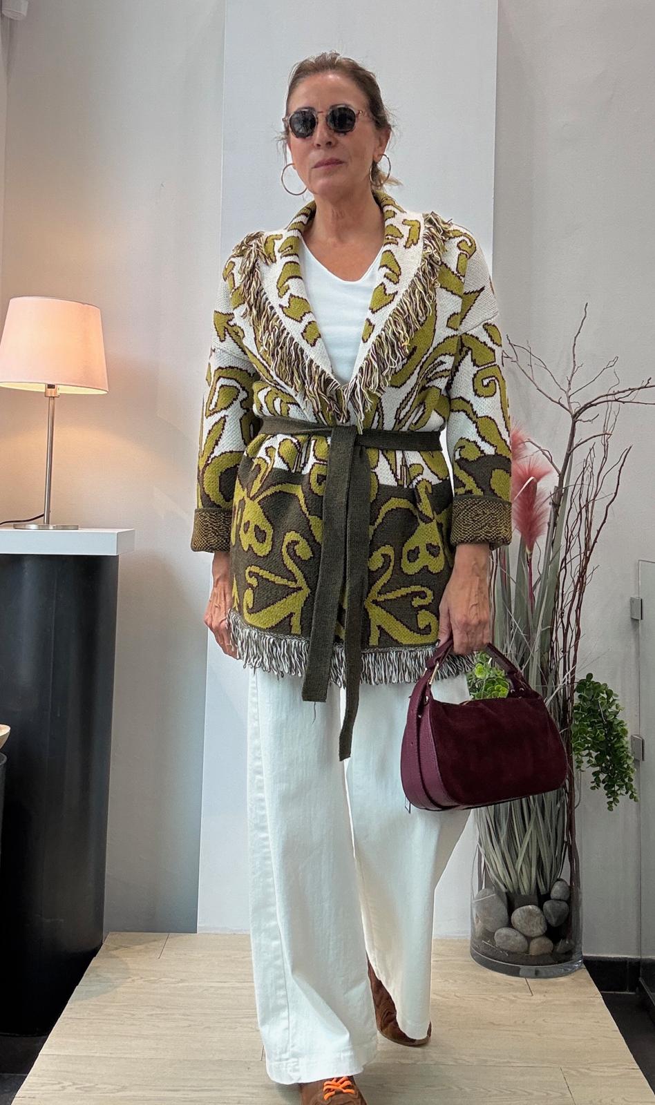 Chaqueta de jacquard con cuello smoking y flecos. Lleva cinturón.