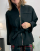 Chaquetón de paño con cuello chimenea, cremallera y cinturón.