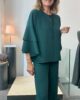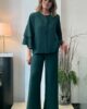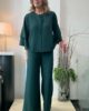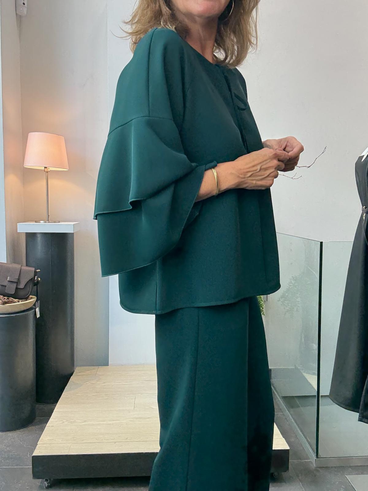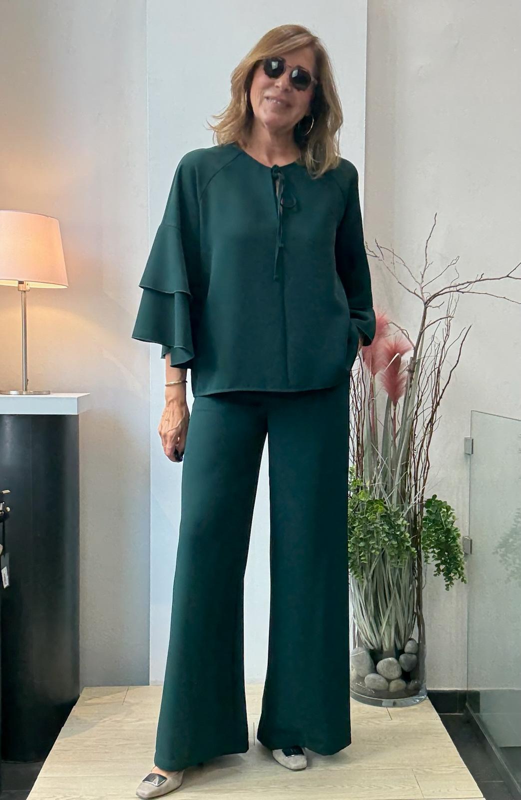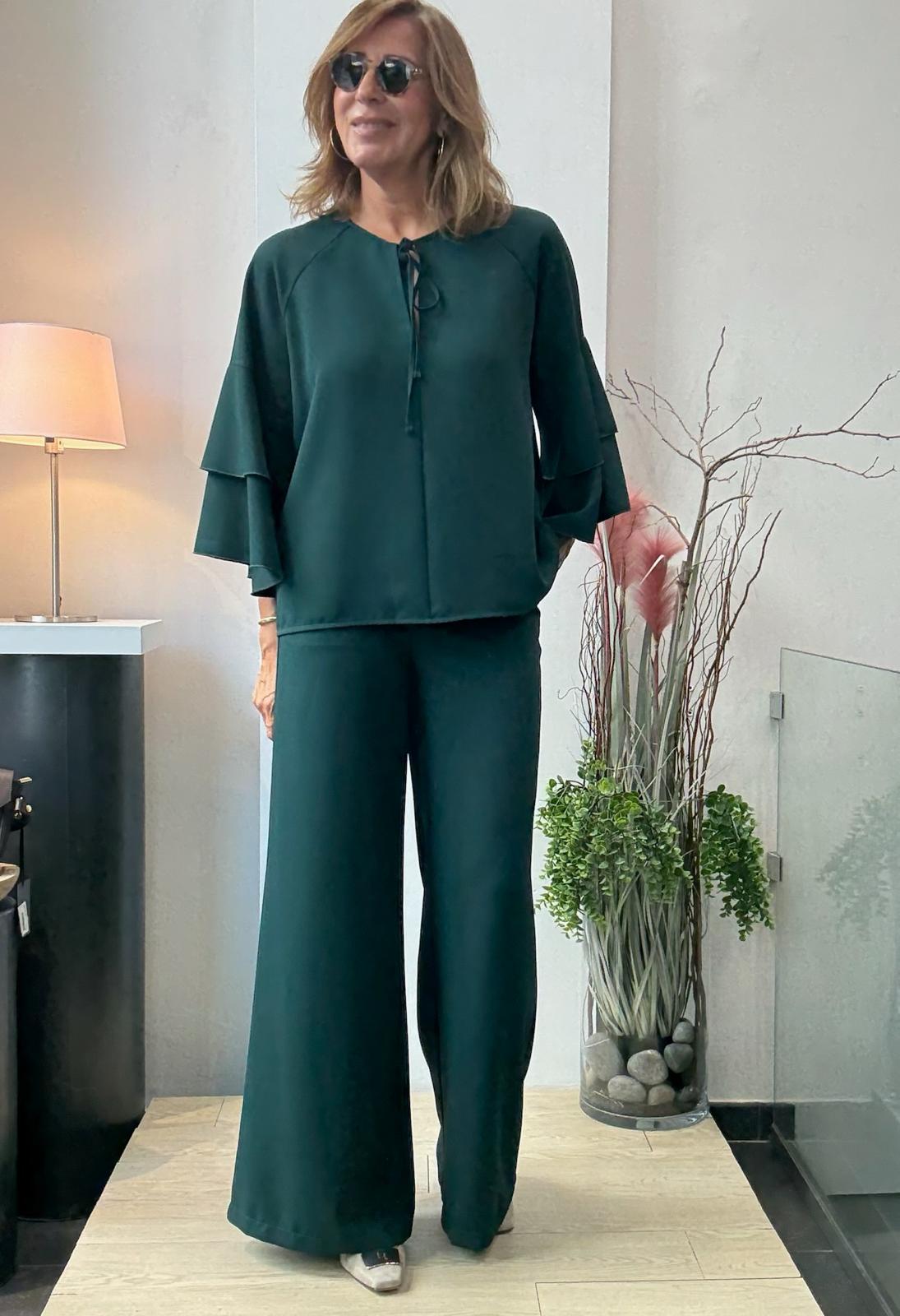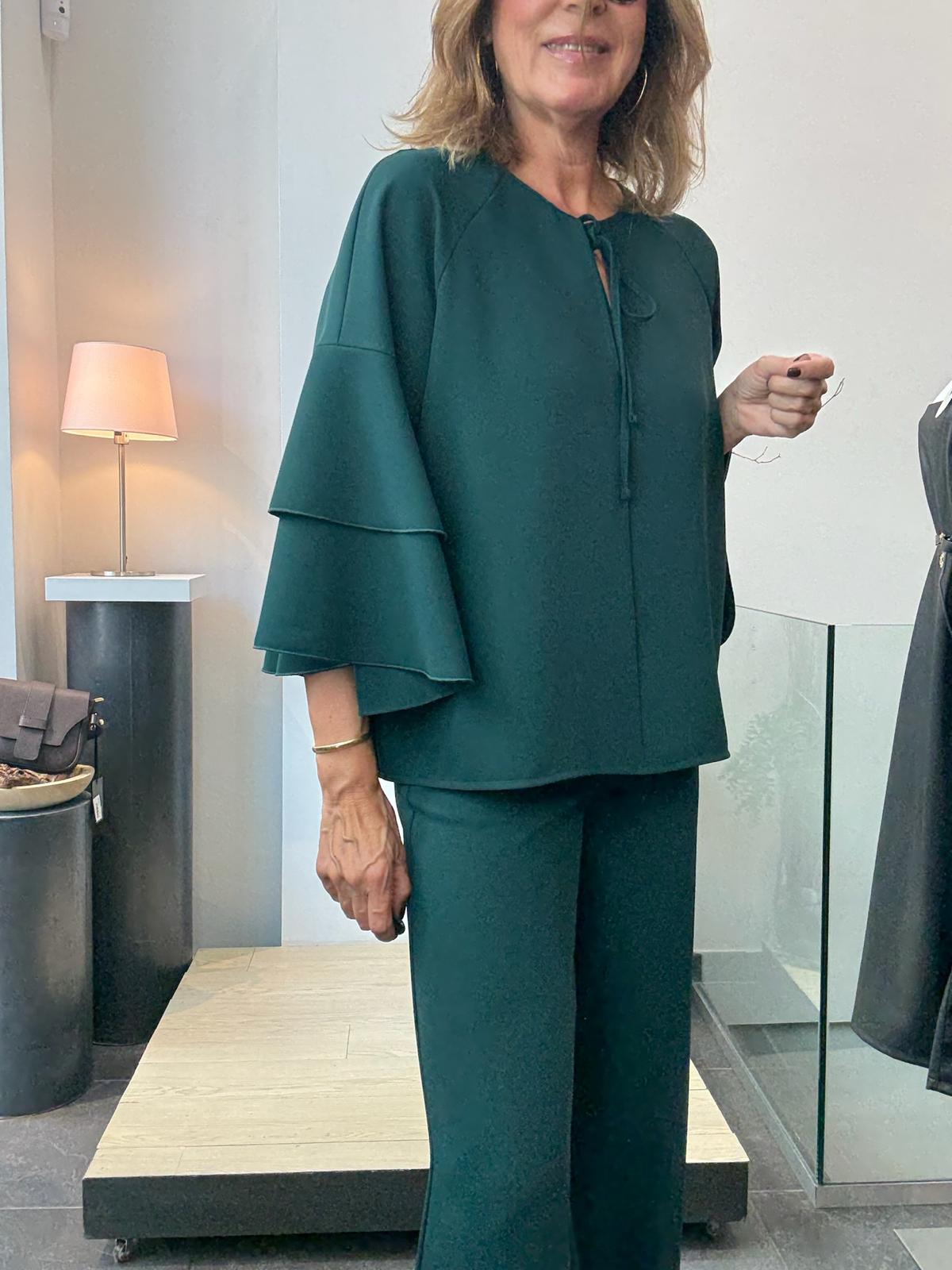 Top amplio con escote redondo con lazada. manga ranglan con volantes súper puestos al biés.