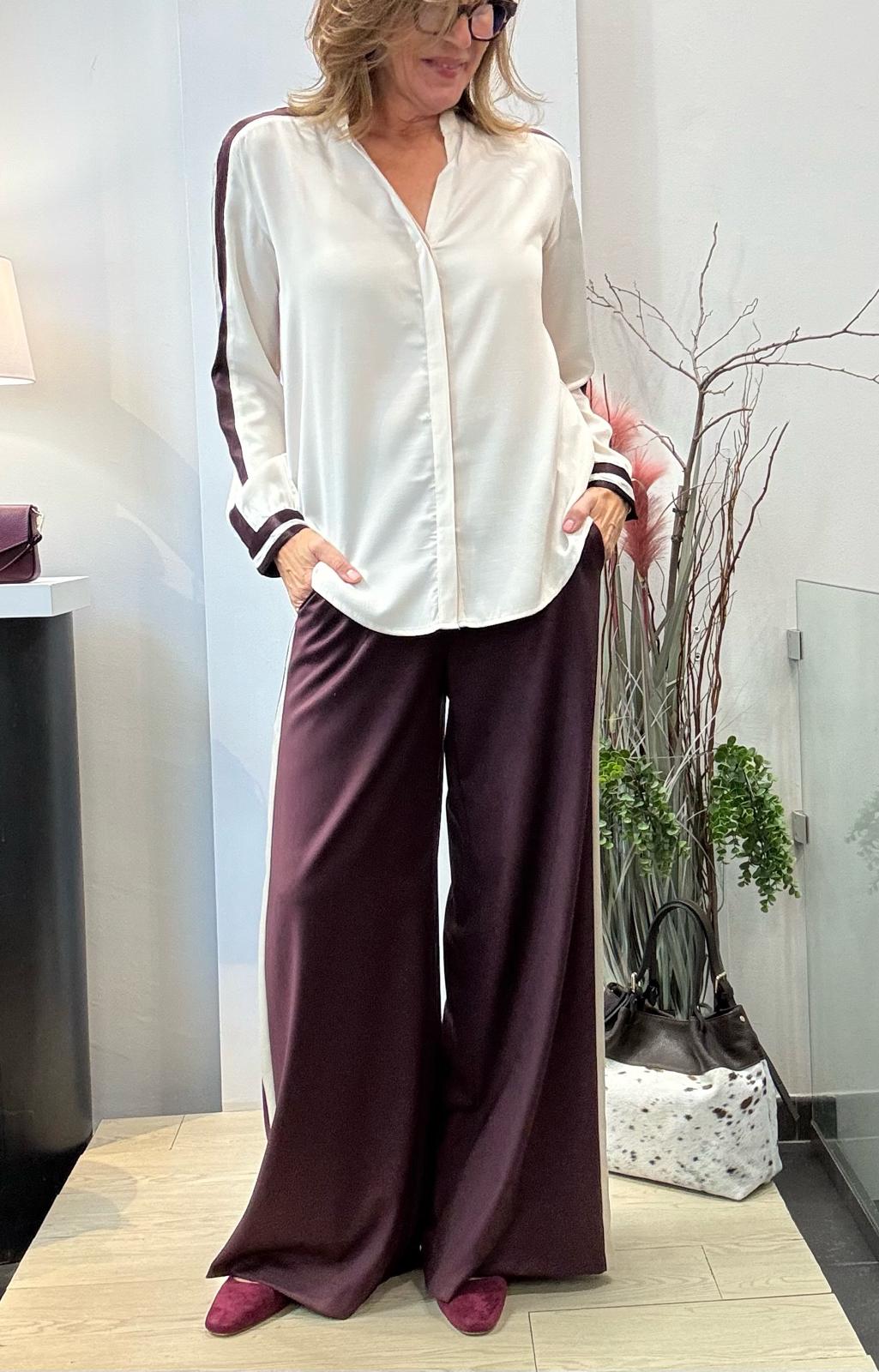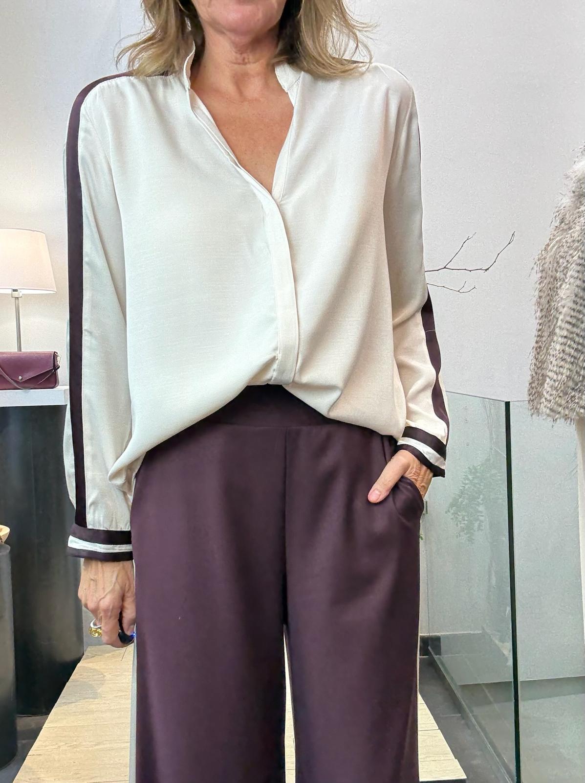 Blusa con tirilla ,escote pico y manga con banda lateral bicolor.