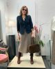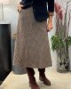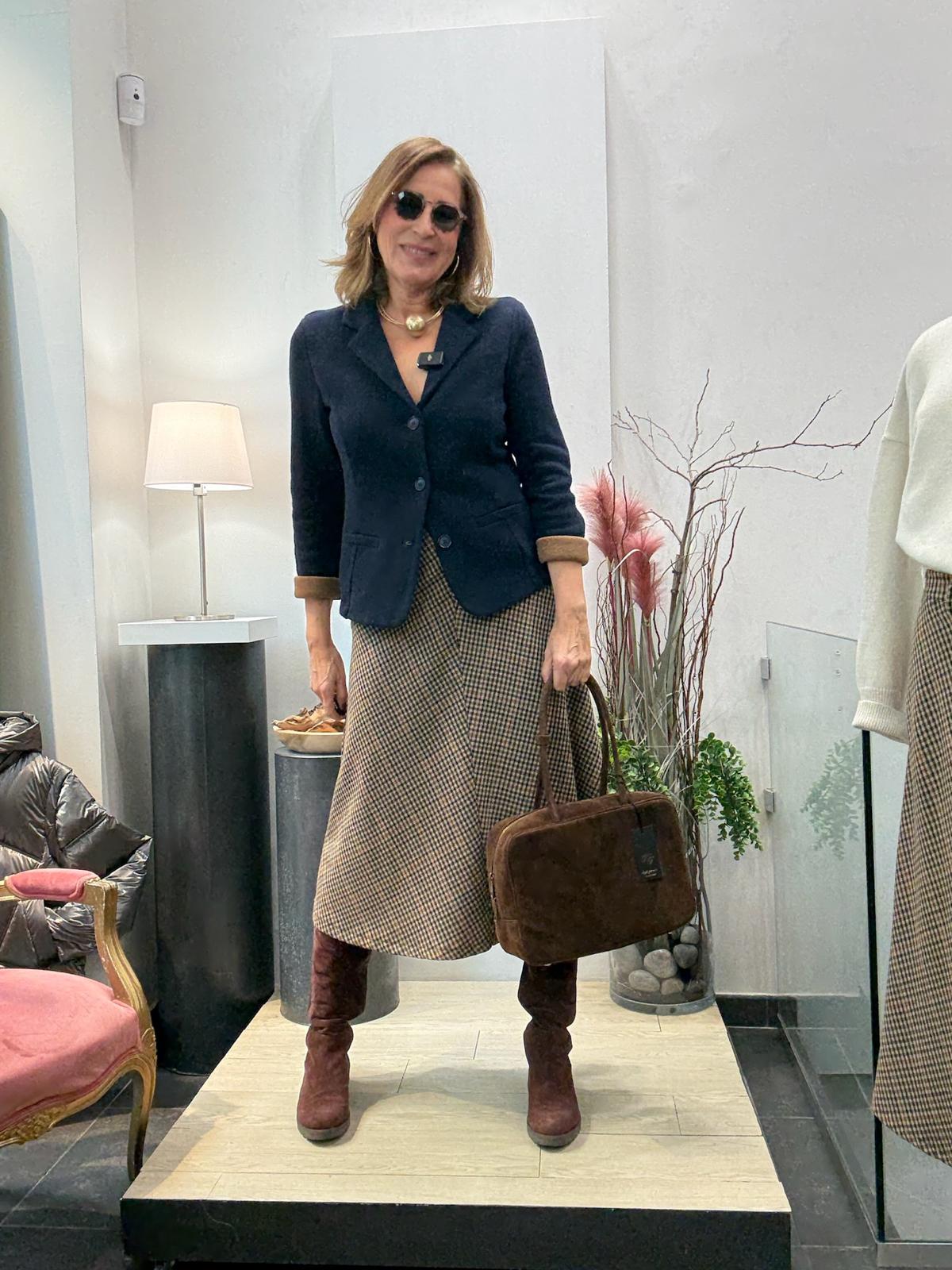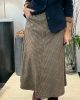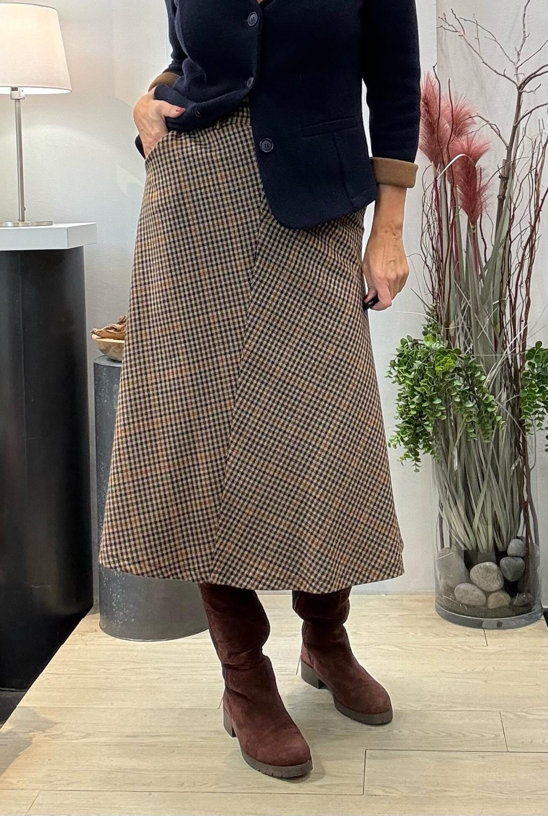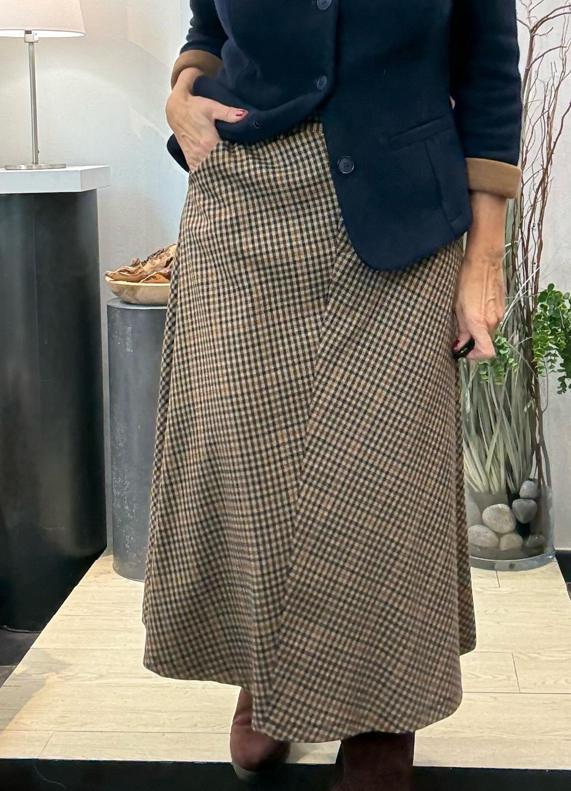Falda de cuadros ( beige, naranja, marino y marrón) cortada al biés con bolsillos y cintura normal.