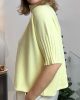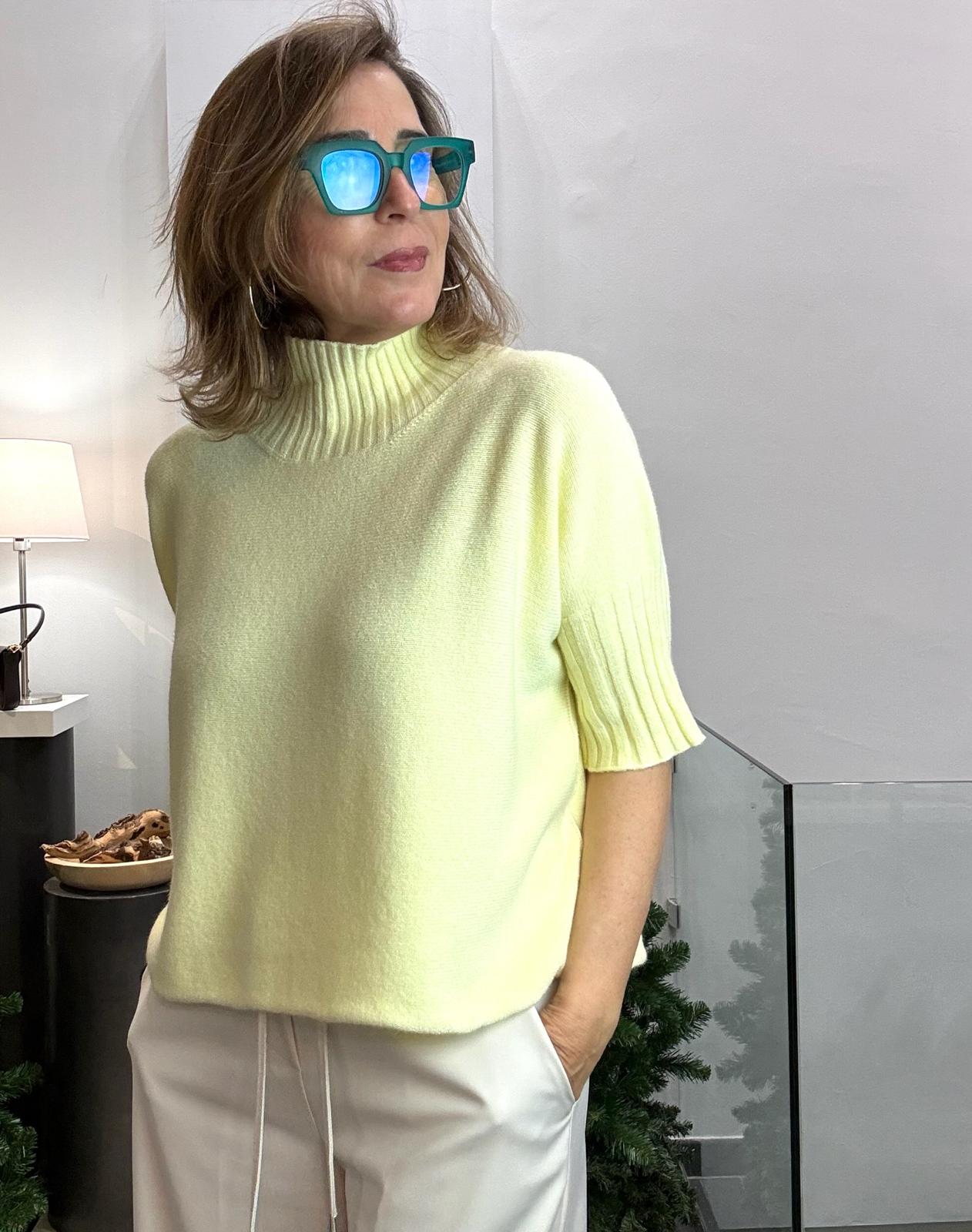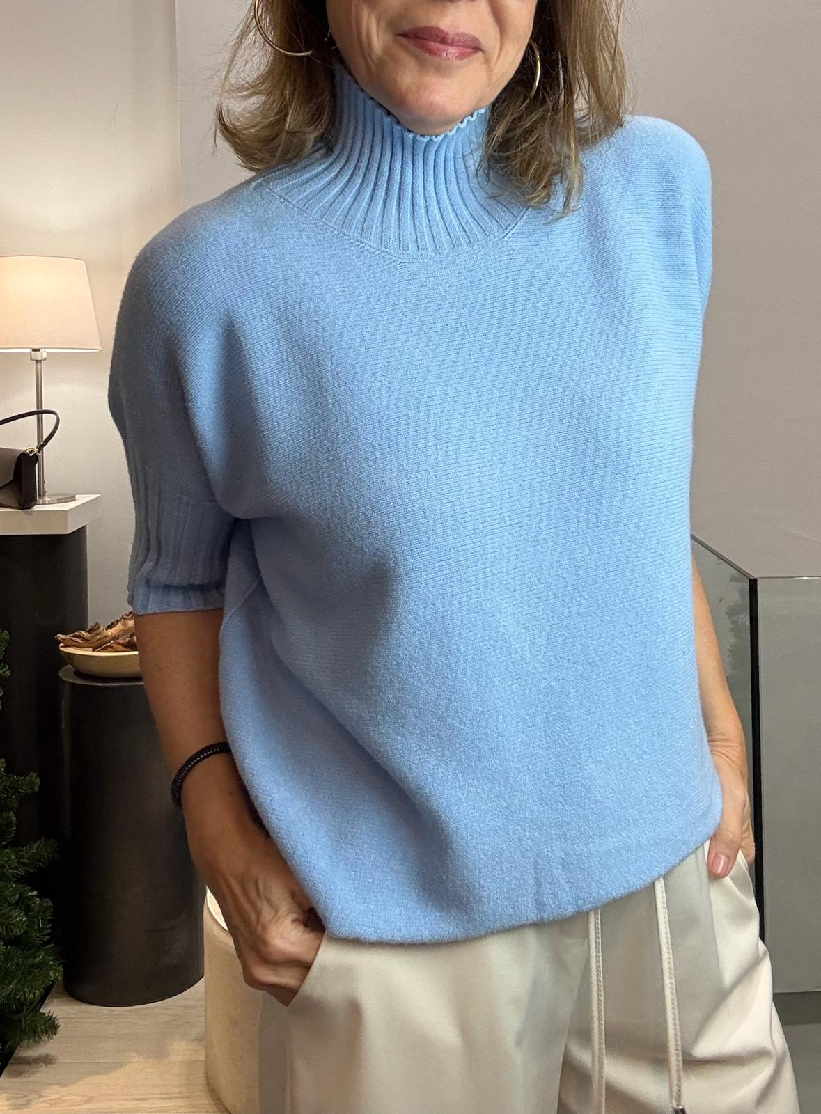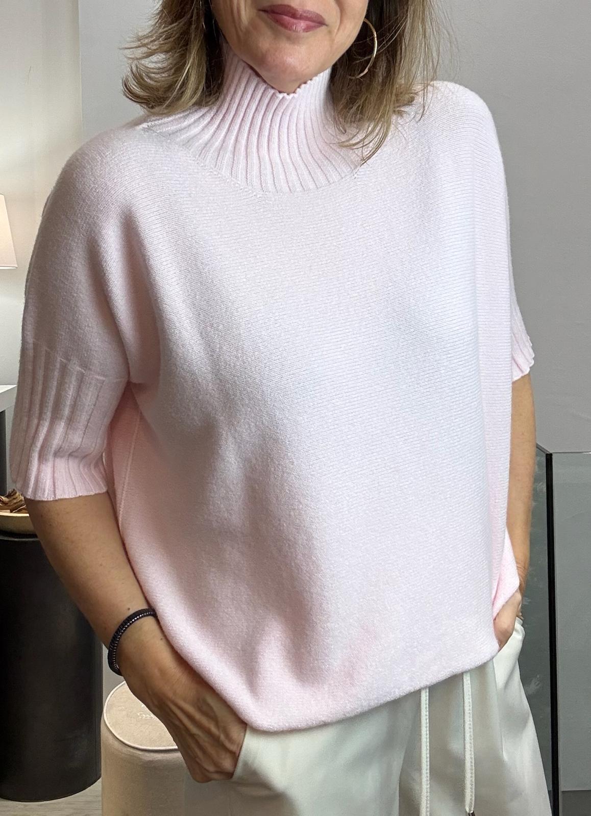 Jersey de punto liso en grosor medio tejido en horizontal. Manga corta con elástico ancho.