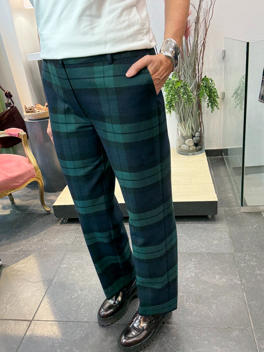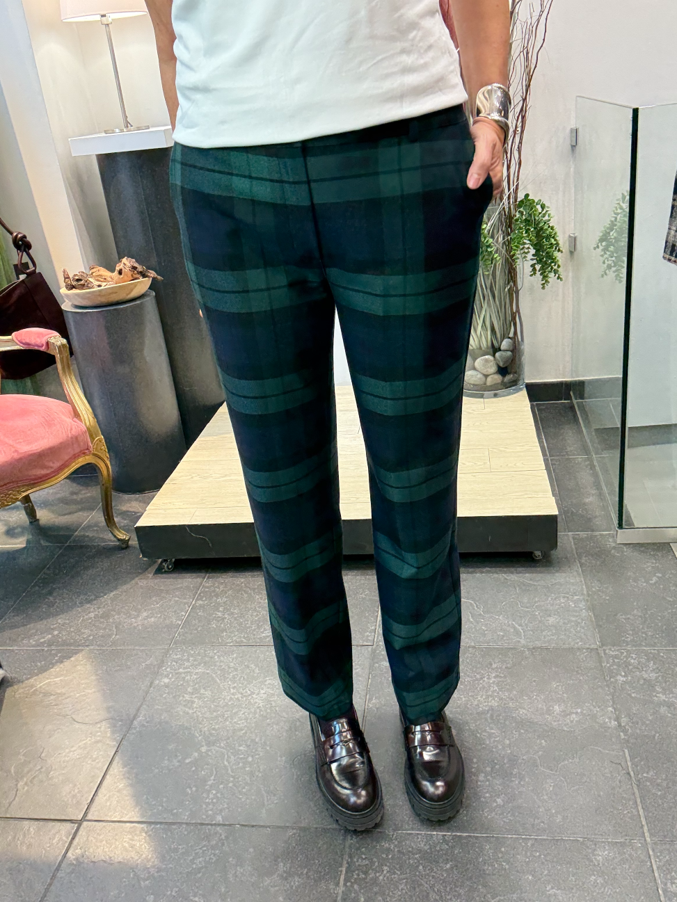 Pantalón de cuadro escocés en verde, amrino y negro. Corte recto y cintura normal. Bolsillo francés.