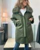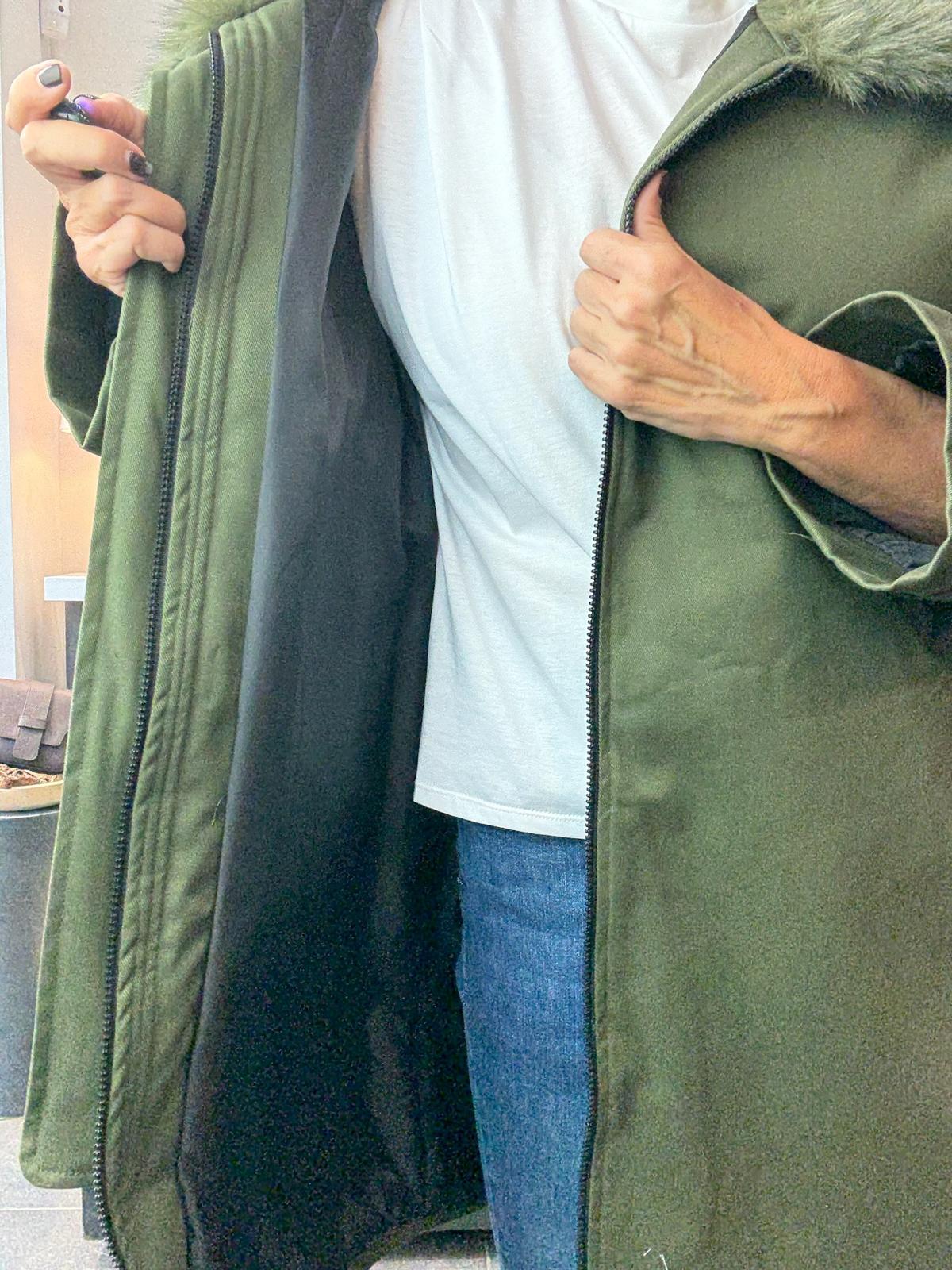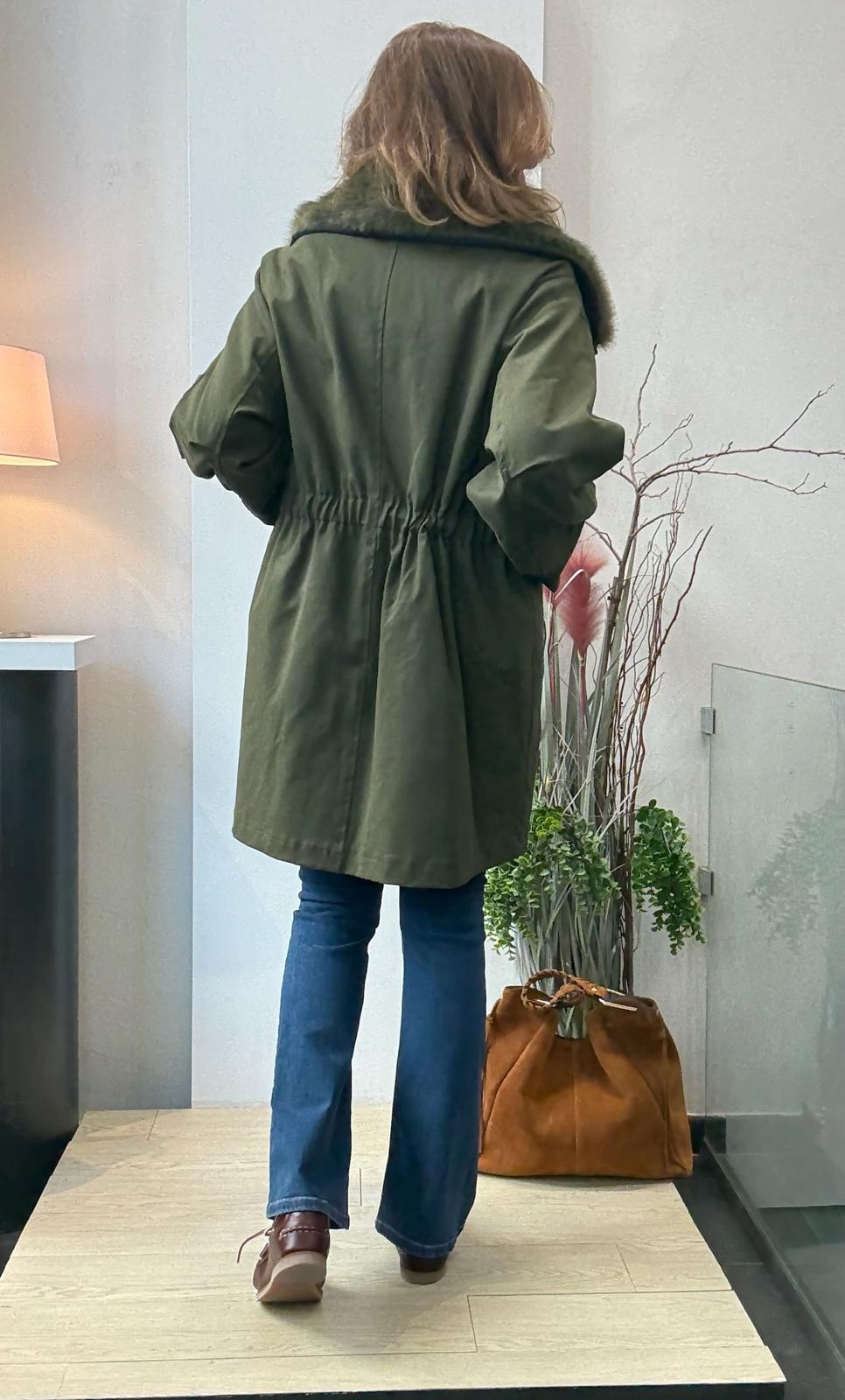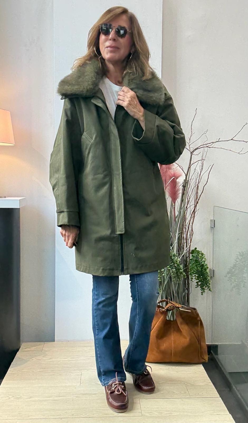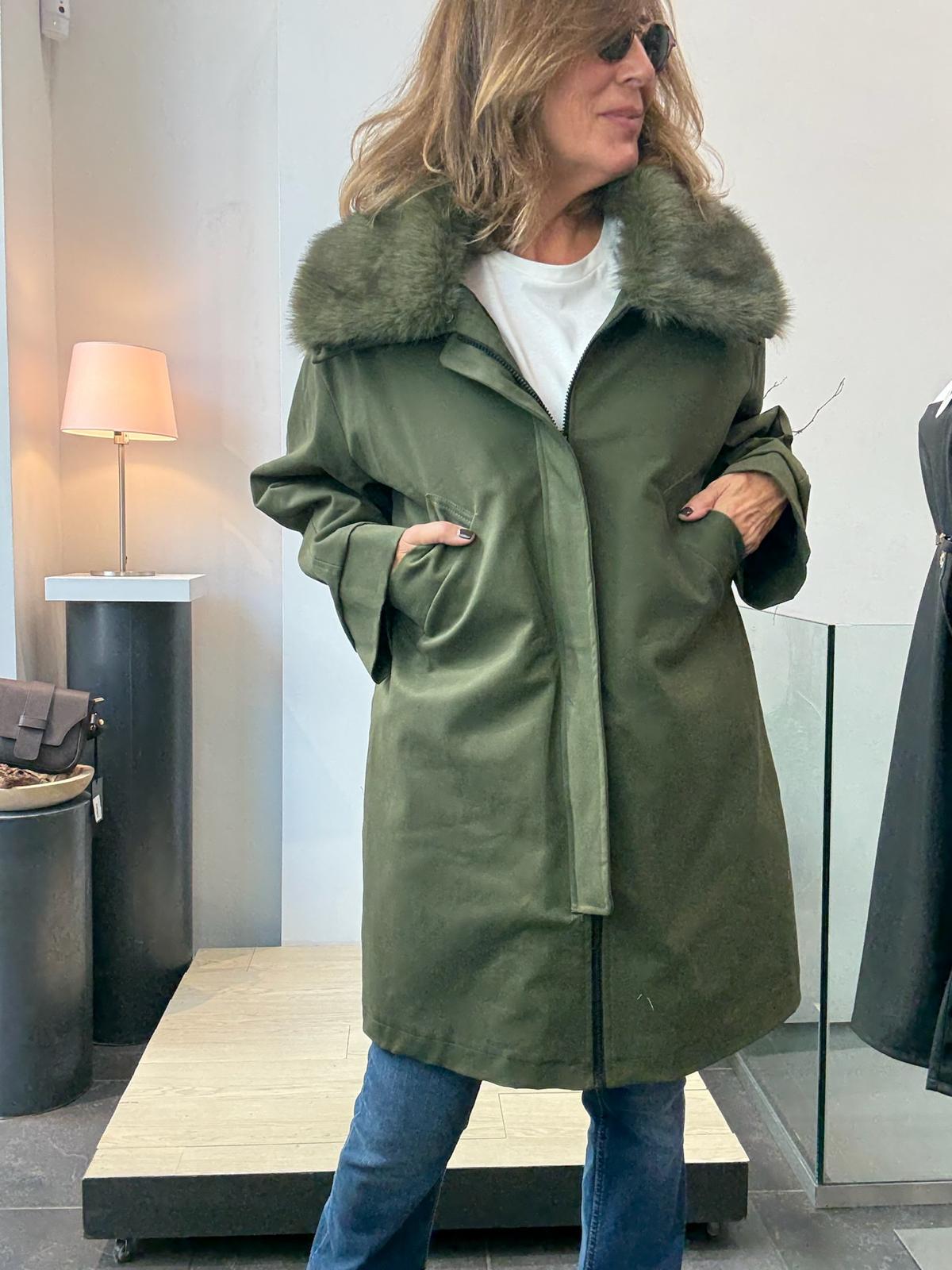 Parka con bolsillos, se abrocha con cremallera. Cuello extraible de piel sintética. Va ligeramente acolchada.