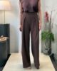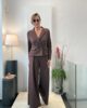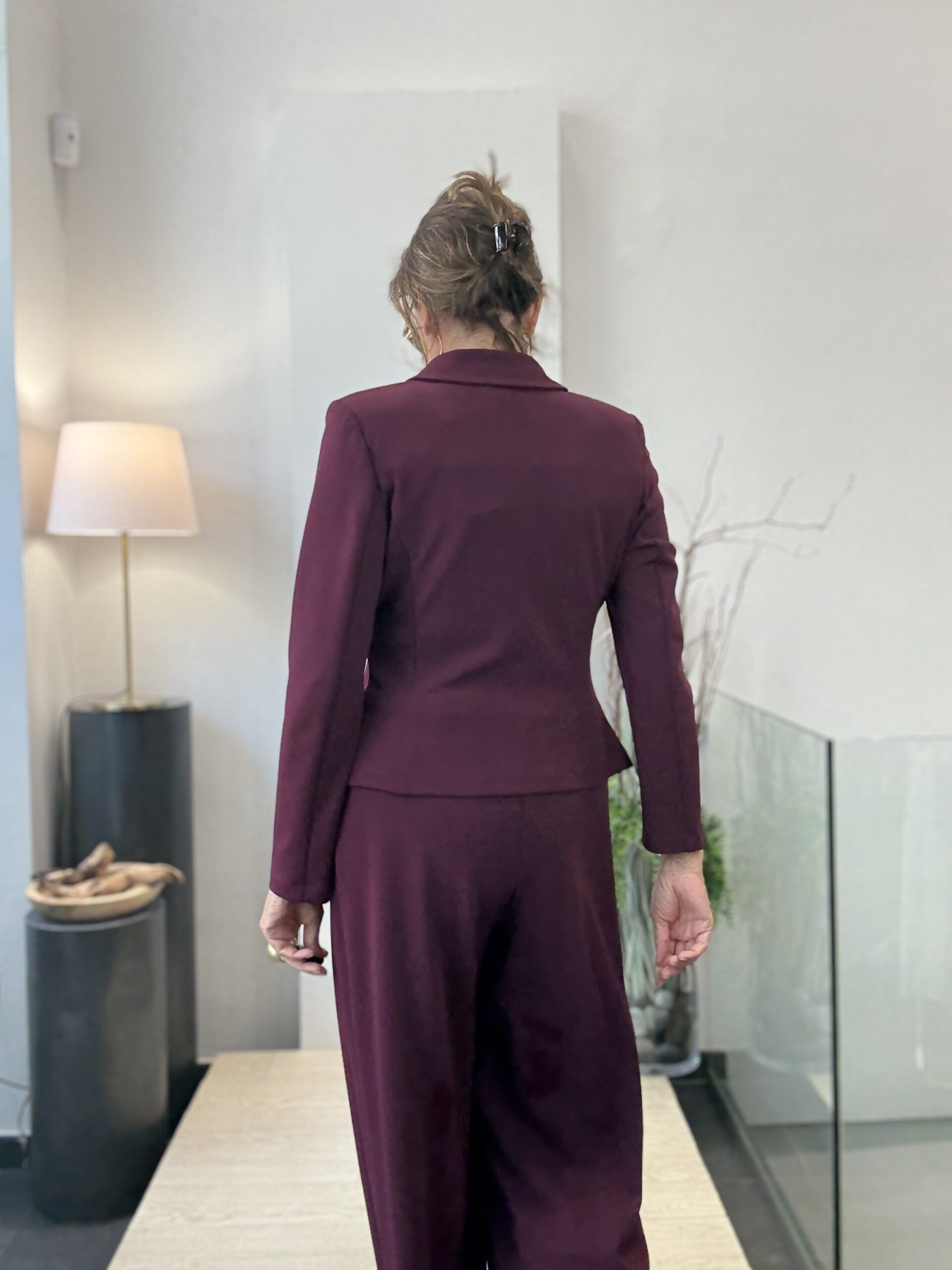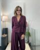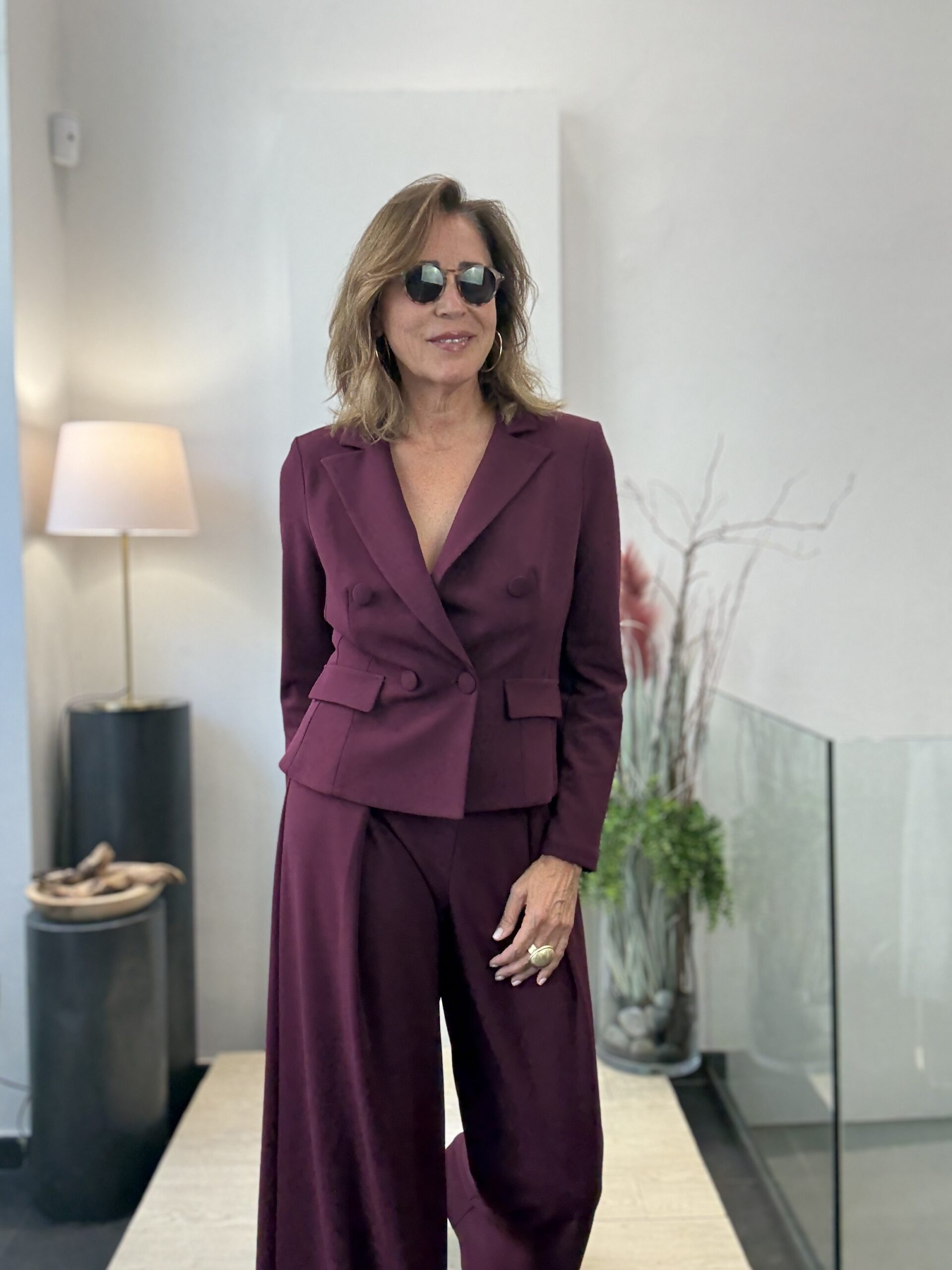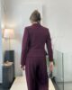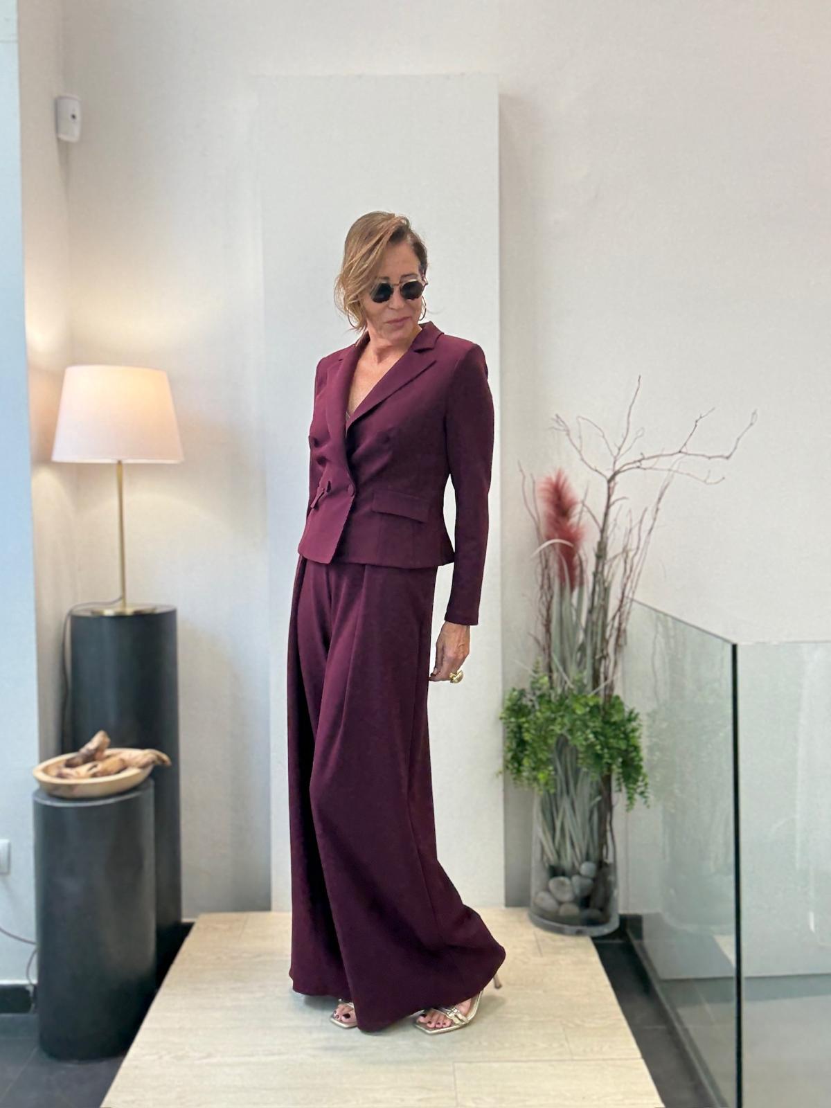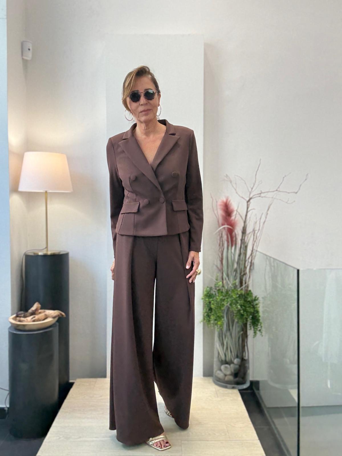 Traje de pantalón ancho y chaqueta corta cruzada con botones forrados.