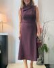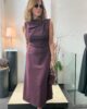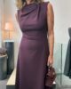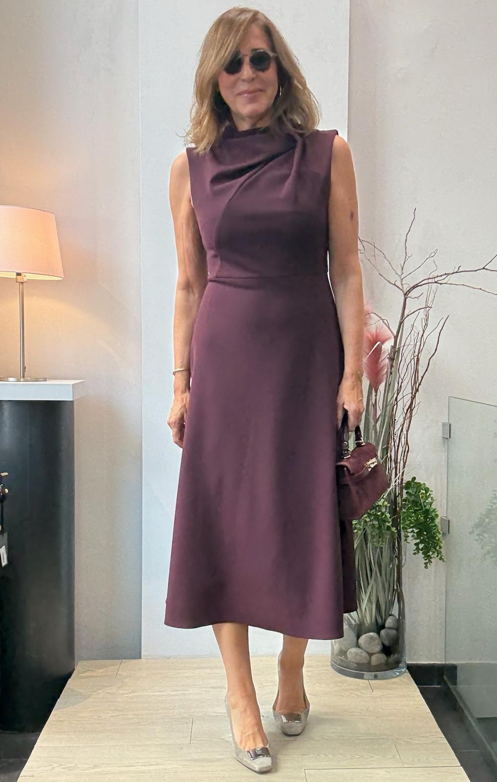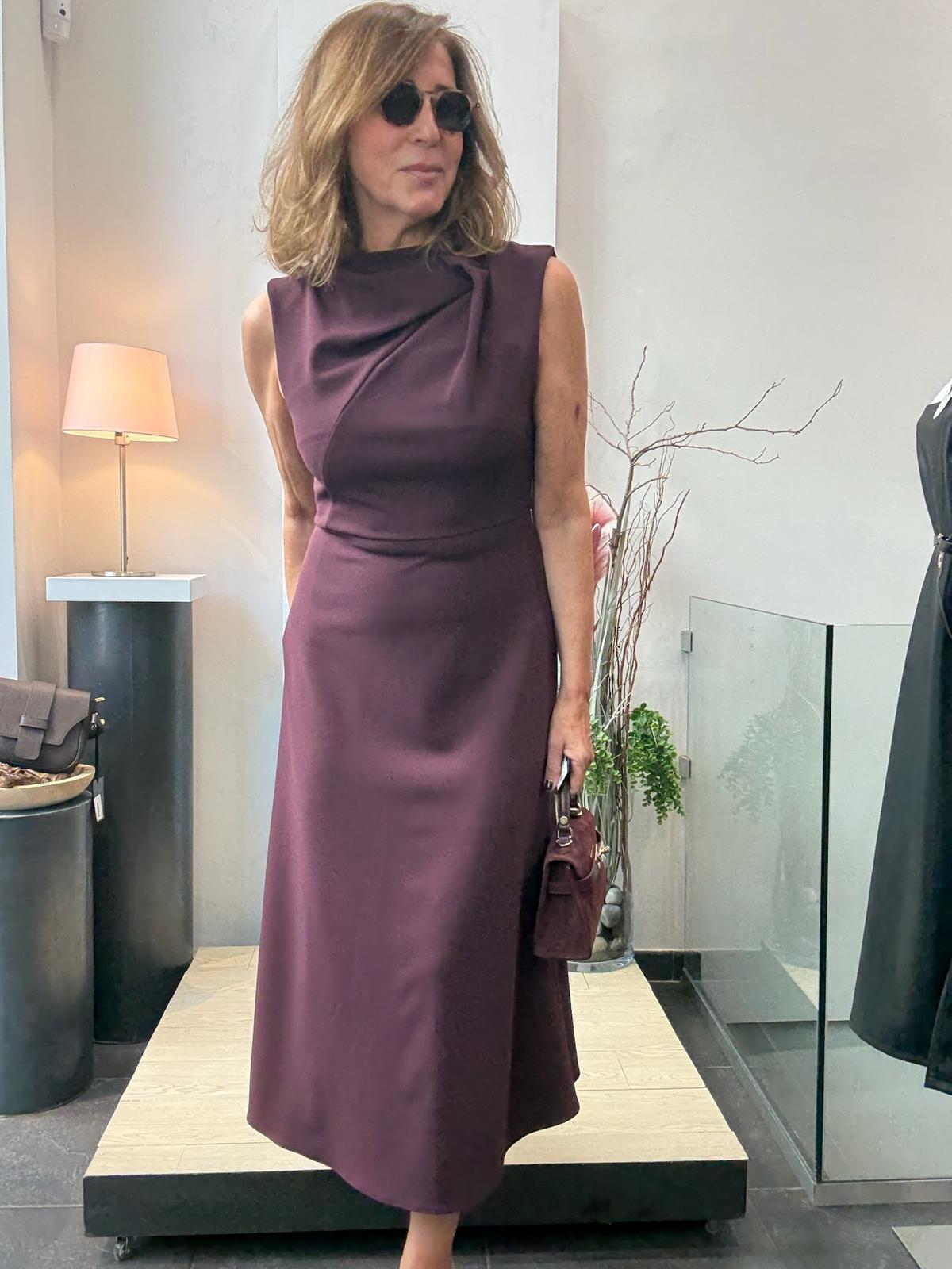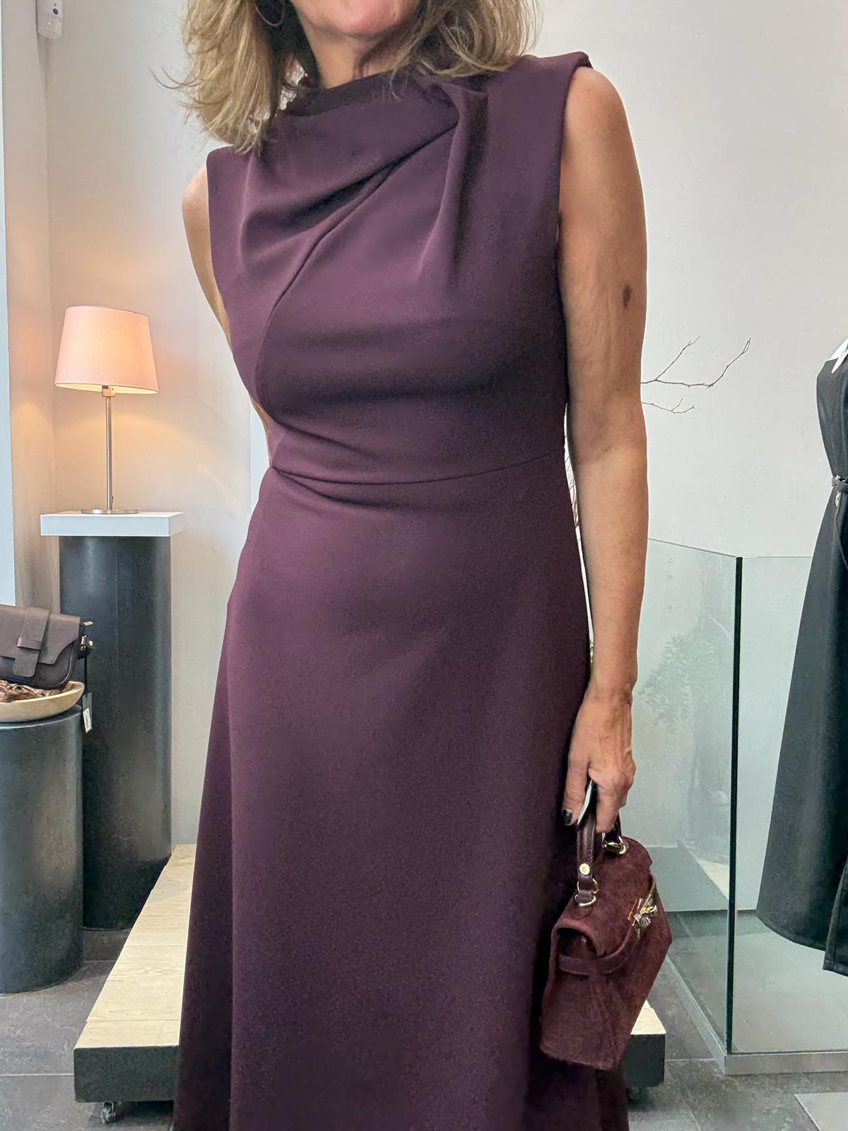vestido en crep elásico,cortado en la cintura con falda evasé. Cuello chimenea con recogido lateral. Sin mangas.