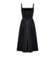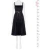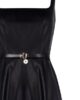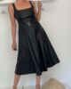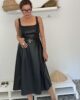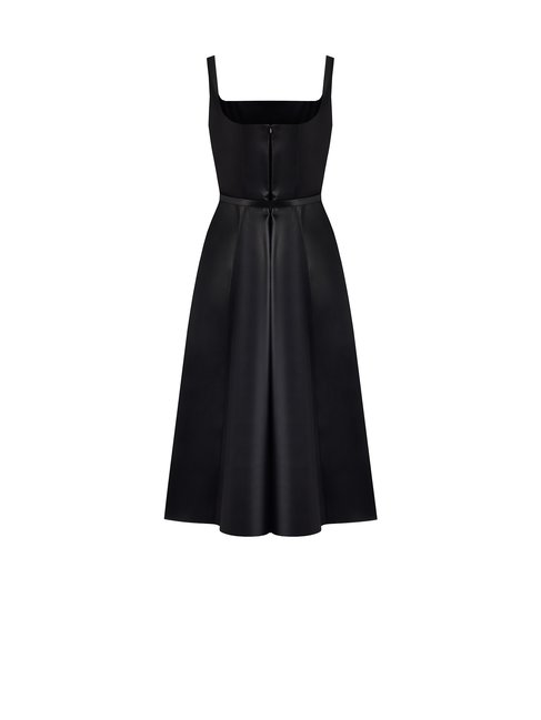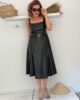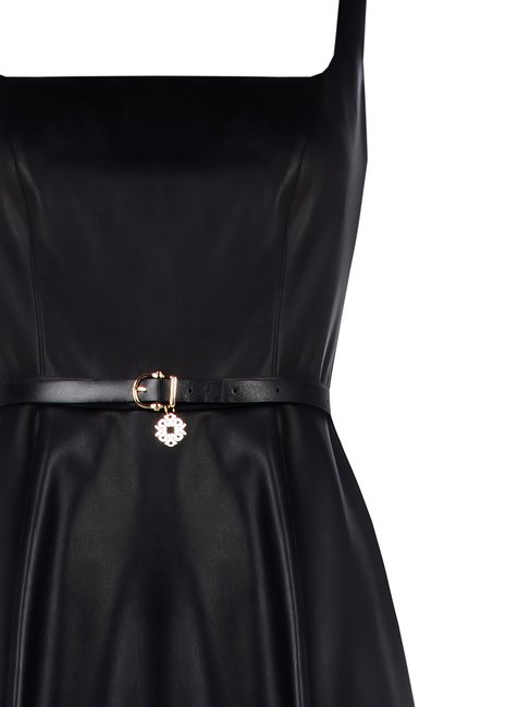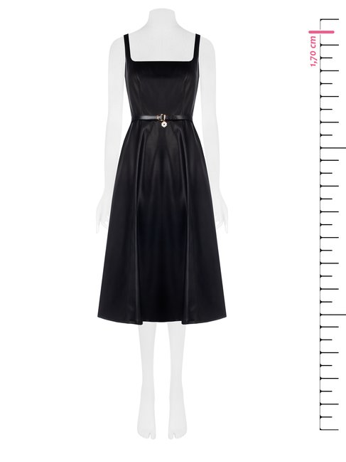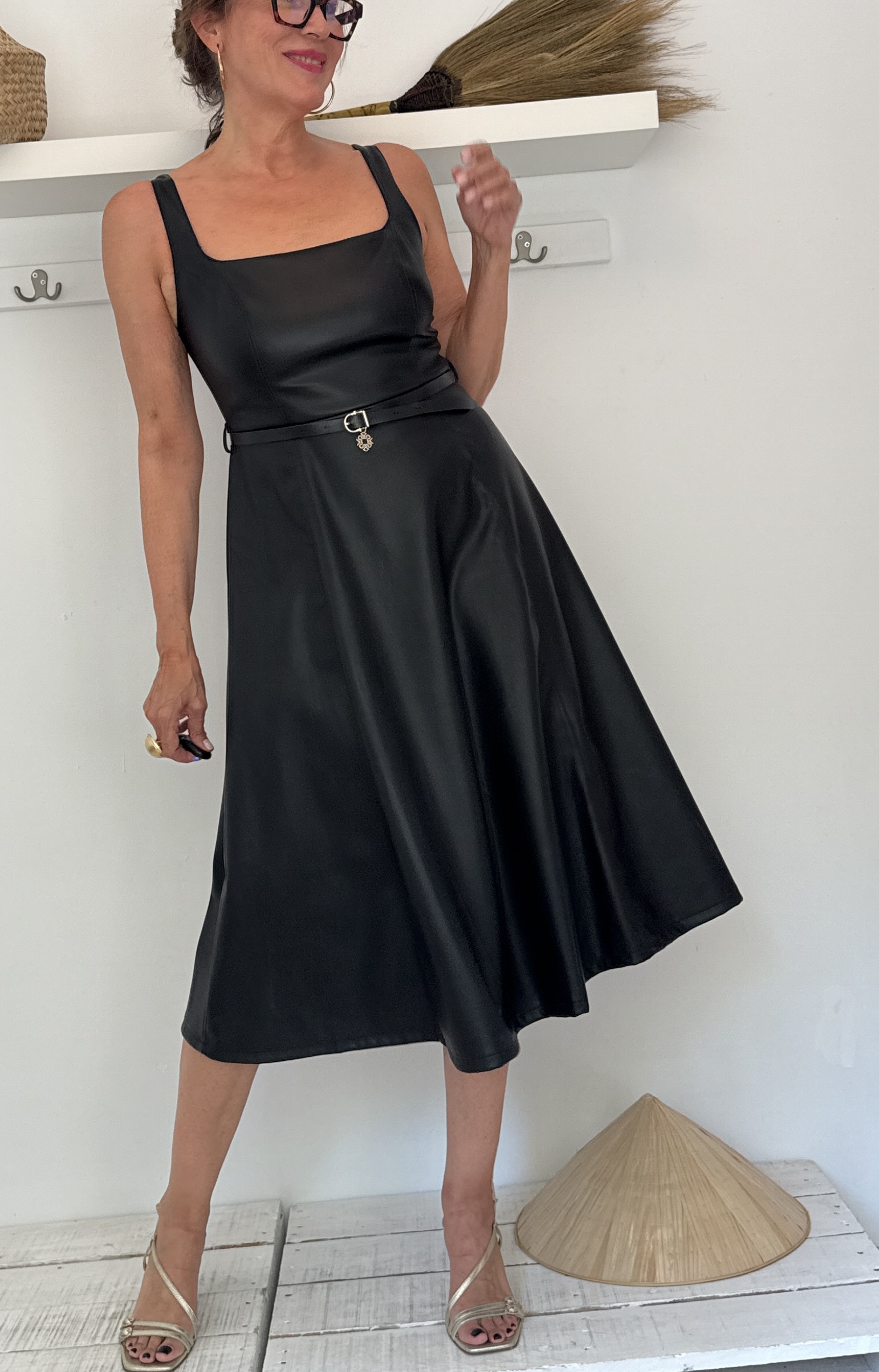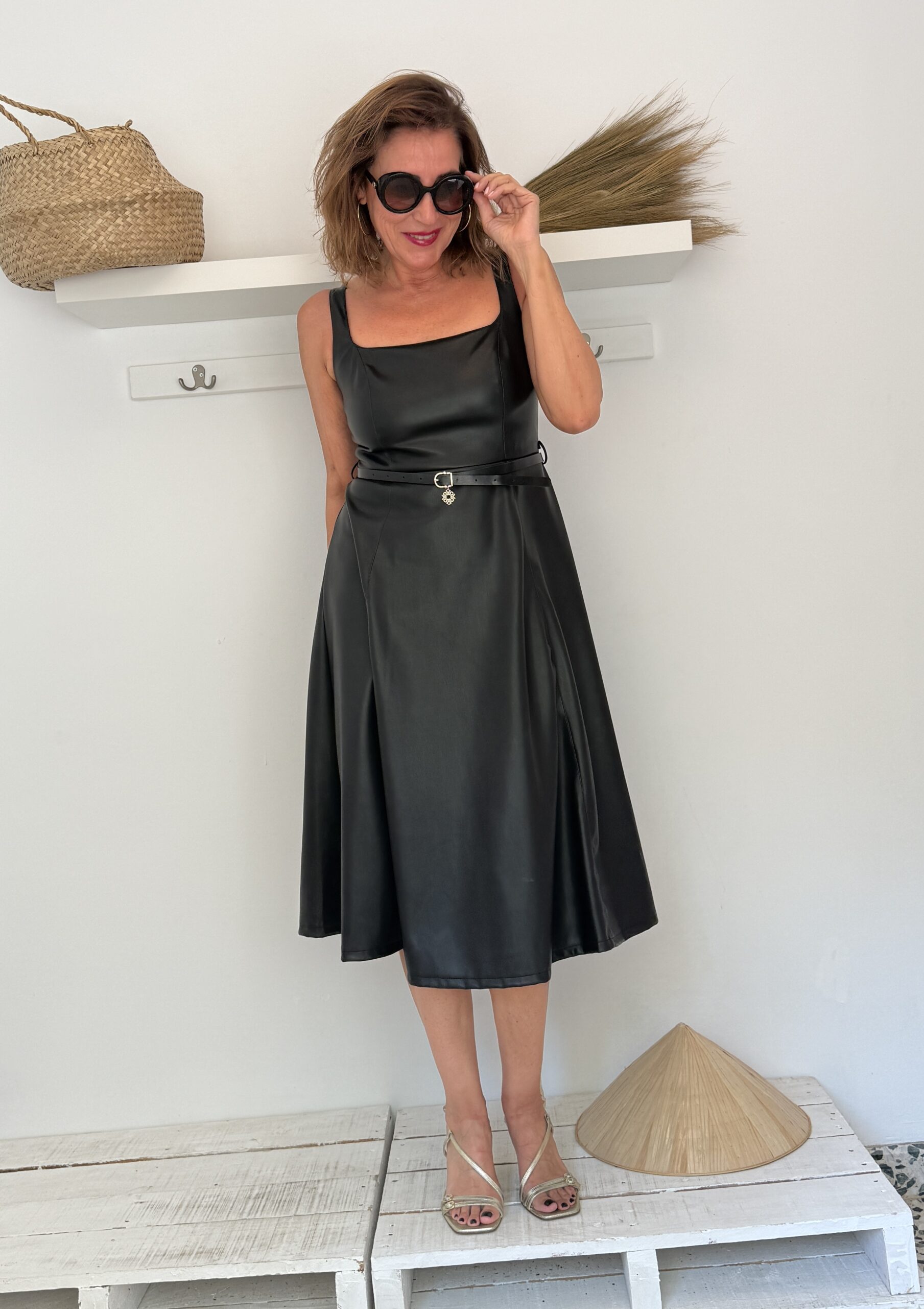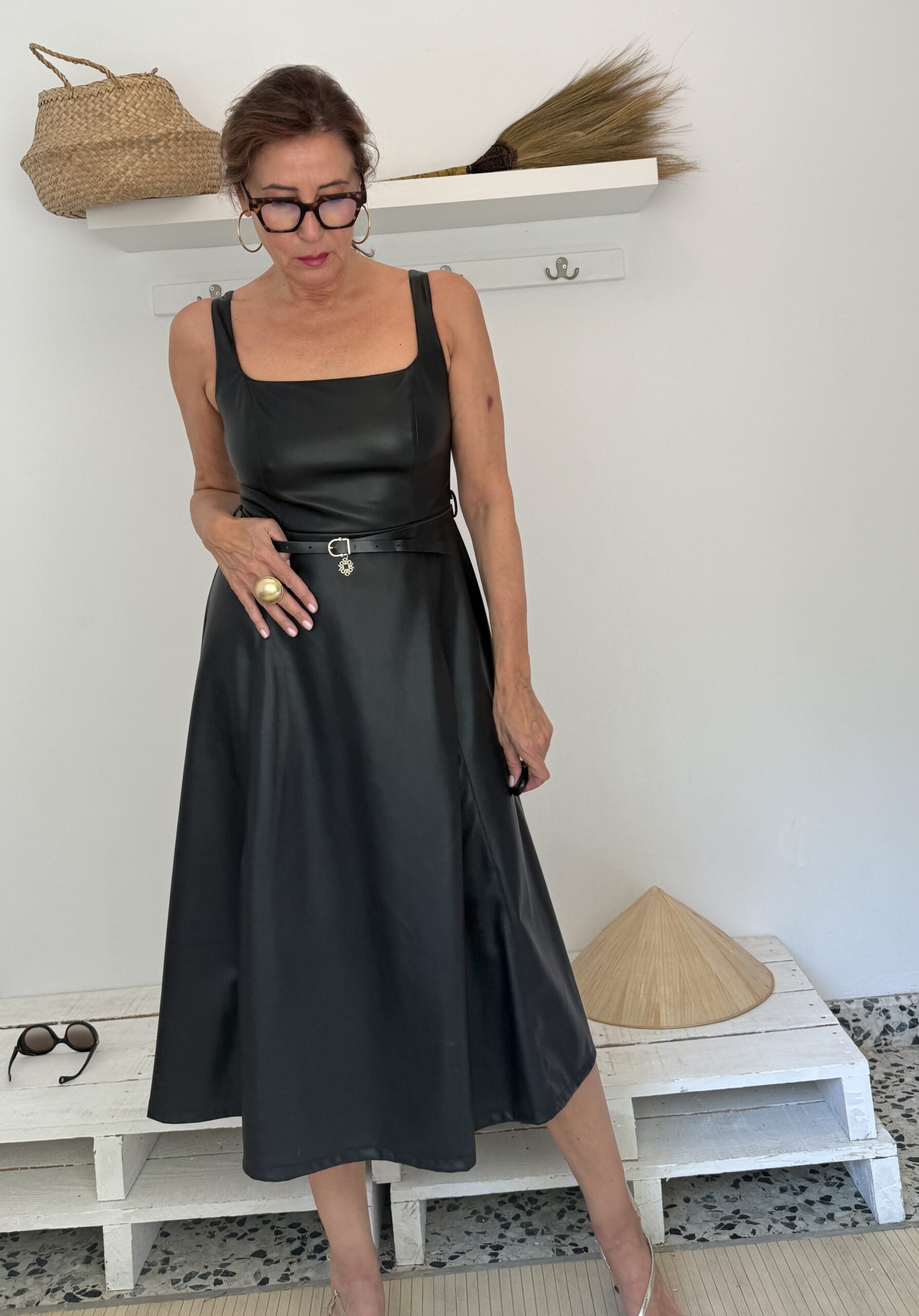 Vestido de ecopiel con tirantes. Va cortado en la cintura y falda evasé. Lleva cinturón.